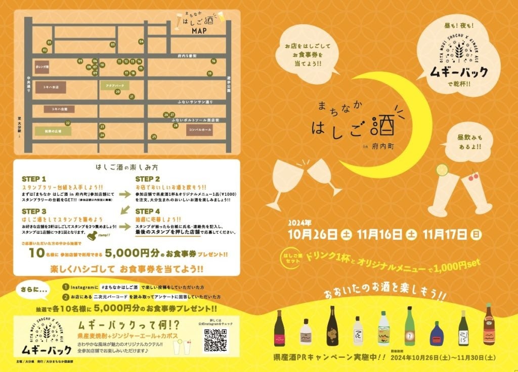 ムギ―バックを提供する府内町の28店舗で、はしご酒イベント「まちなかはしご酒in府内町」を開催。