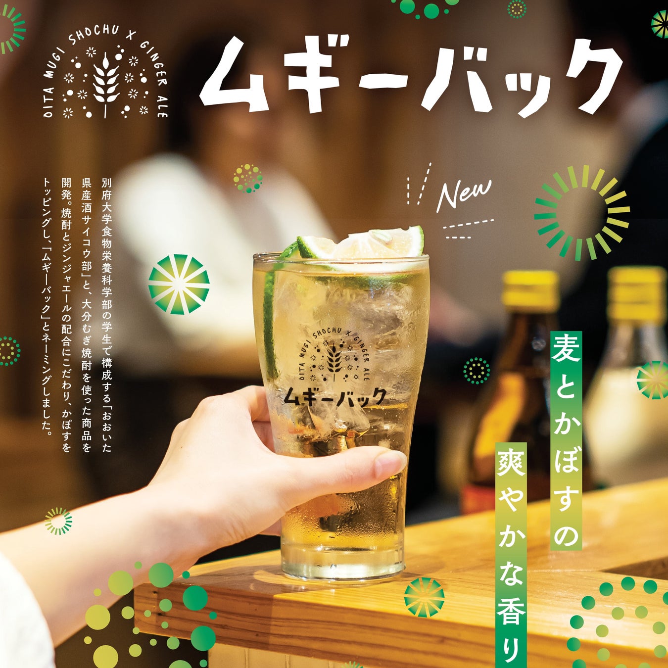 令和6年10月26日(土)~11月30日(土)までの期間中、大分市中心商店街の32店舗で大分むぎ焼酎を使ったオリジナルカクテル「ムギ―バック」が楽しめます。