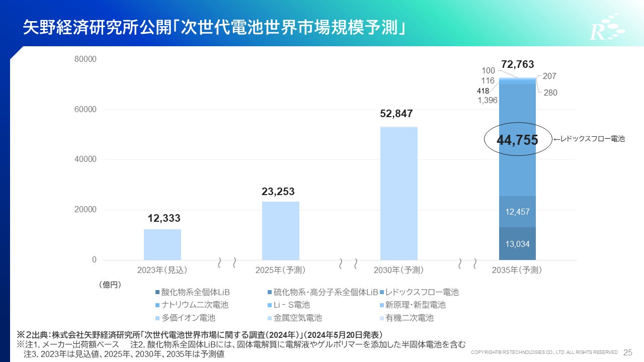 2024年5月20日に株式会社矢野経済研究所から発表された「次世代電池世界市場に関する調査(2024年)」では、2035年のレドックスフロー電池の世界市場規模は4.4兆円を超えると予測されています。