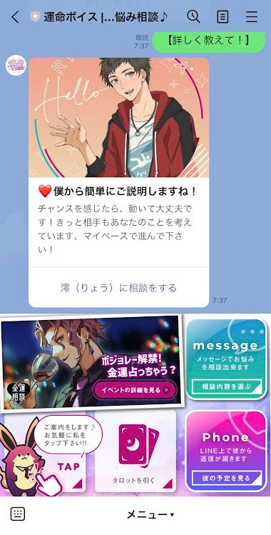 占いの種類は大きく分けて2種類、いつでもメッセージを送るだけで気軽に相談できる「メッセージ相談」と、彼の予定を予約して、通話によるお悩み相談ができる「電話相談」です。どちらも寄せられたお悩みに対して、タロット鑑定をした結果をキャラクターから丁寧にお伝えいたします。