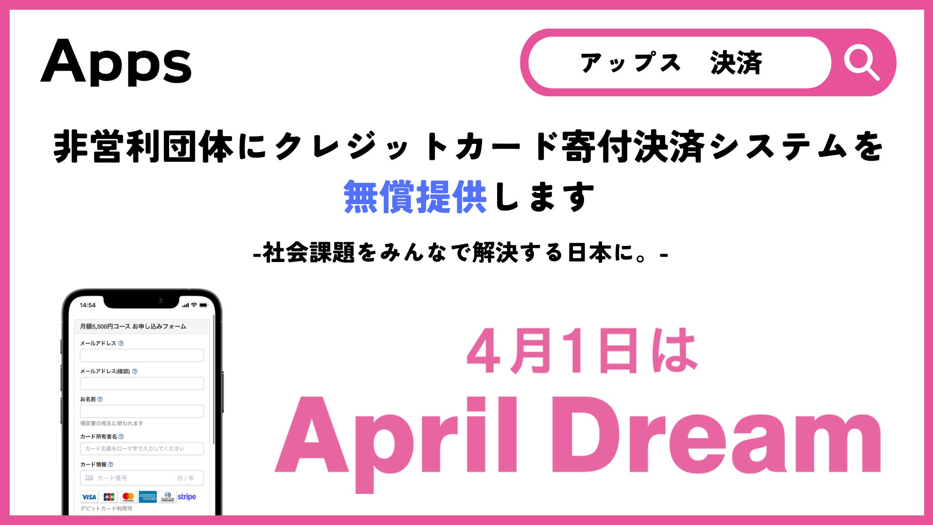 また、当社はNPOやNGOなどの団体に対して、Appsサービスを無償で提供しています(なお、カード会社の決済手数料は別途発生します)。