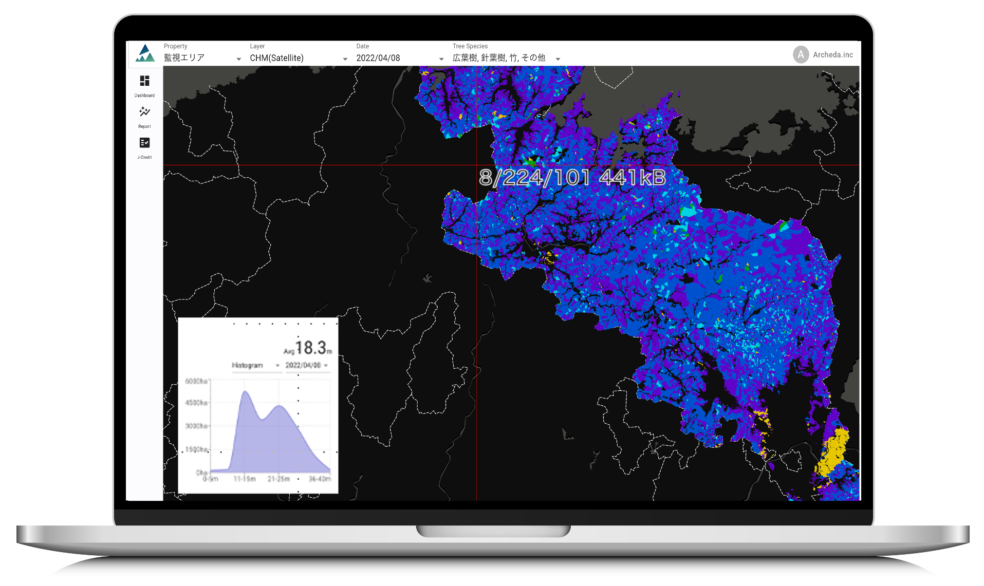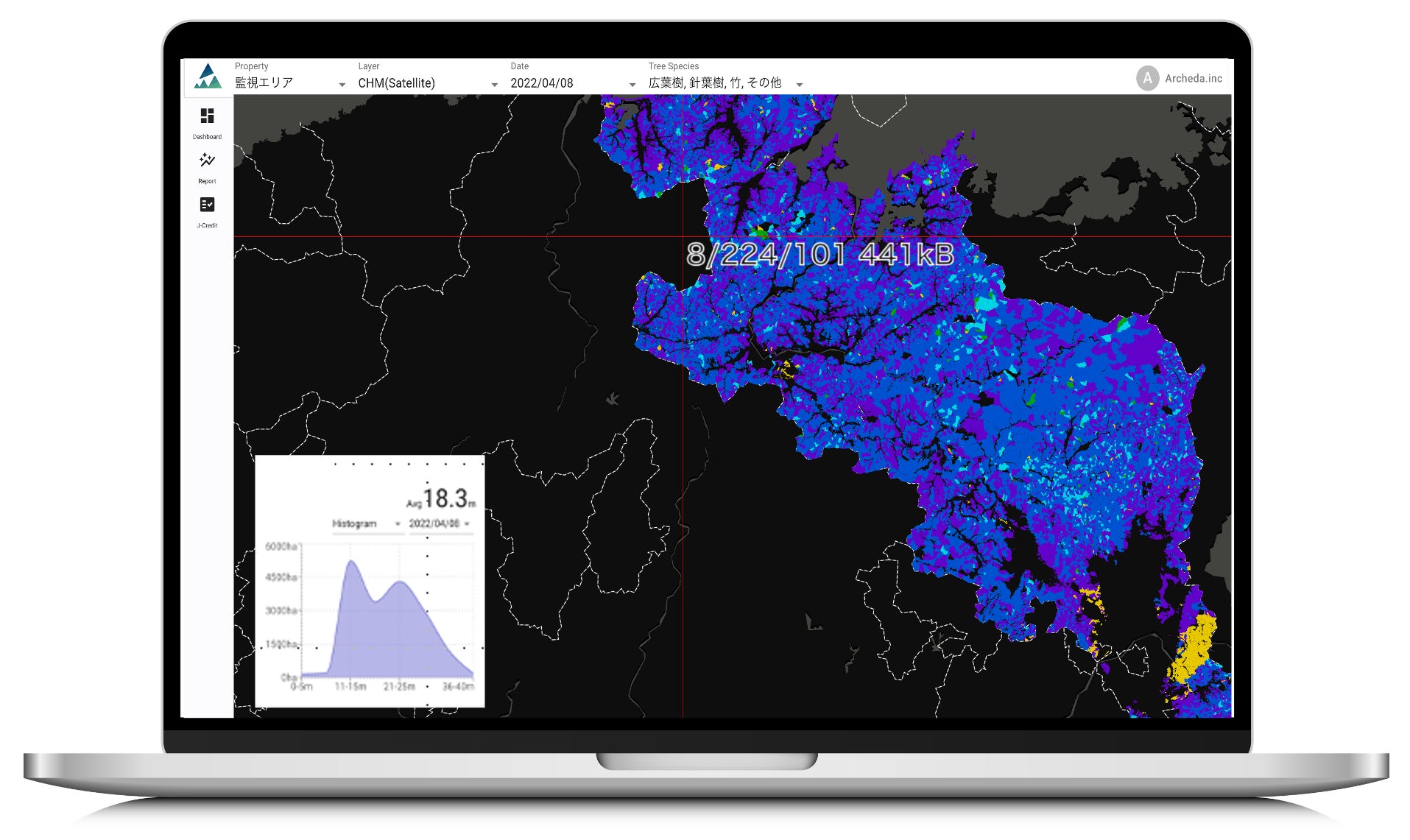 Green Insightは、衛星データやドローンのLiDARデータ等のリモートセンシングデータを独自の機械学習モデルにより解析し、森林のCO2吸収量推定や森林破壊の検知、地盤変化の検出等が可能なクラウド型のWebサービスです。
