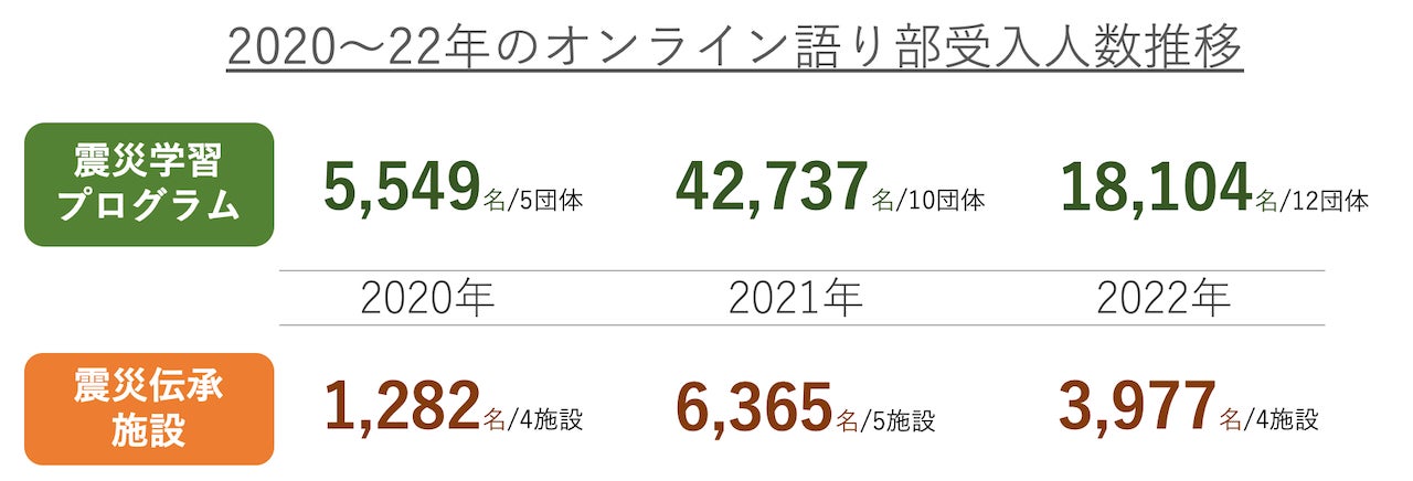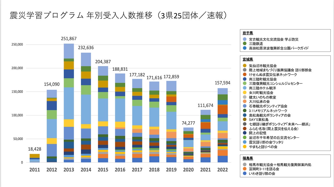 - 2022年の「震災学習プログラム」年間参加者数(25団体の合計)は、157,594名。新型コロナウイルス流行前・2019年の91%まで回復した。オンラインを通じたプログラム参加者数18,104名を加えると、微増となっている。