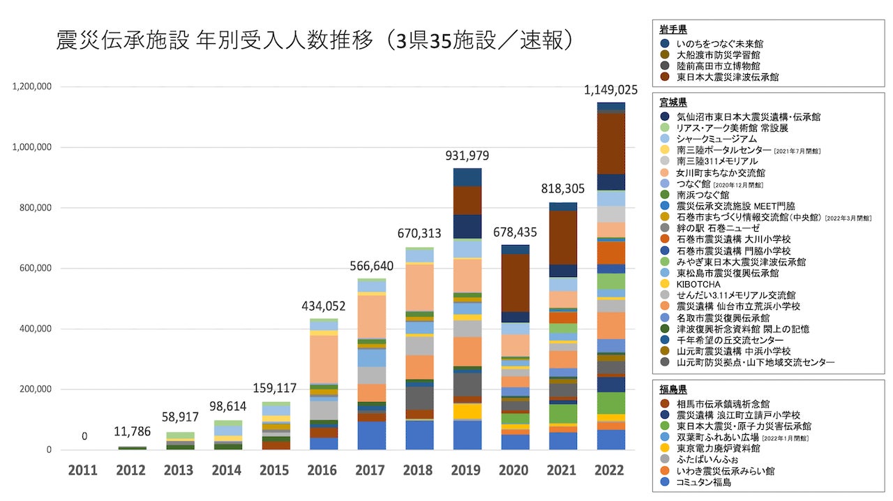 - 「震災伝承施設」は施設数自体も増加しており、2022年の年間来館者数(35施設の合計)は、1,149,025名で、2011年以降最多となった。