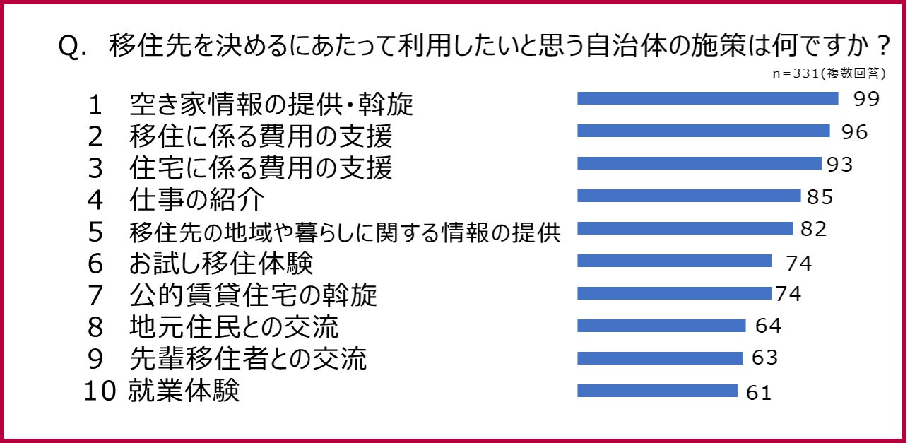 1位は「自治体等のホームページ」、2位以降も自治体等からの入手方法が続きました。また、デジタル技術を活用した新しい情報入手方法として「オンラインイベント・移住相談会」が7位となりました。YouTubeやX(Twitter)、口コミなどの生の声を求めている方も多い結果となりました。