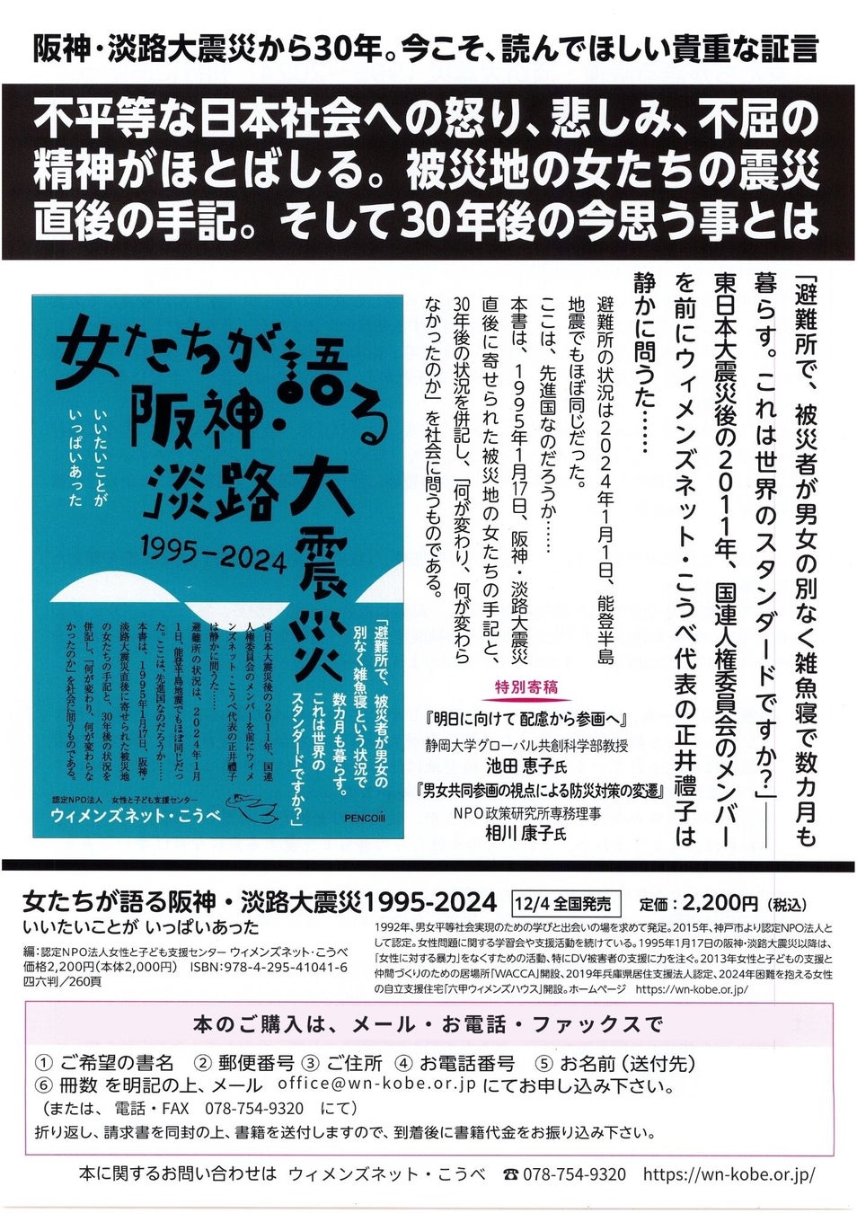 認定NPO法人女性と子ども支援センターウィメンズネット・こうべは、このたび『女たちが語る阪神・淡路大震災1995-2024 いいたいことがいっぱいあった』(ペンコム)を出版しました。