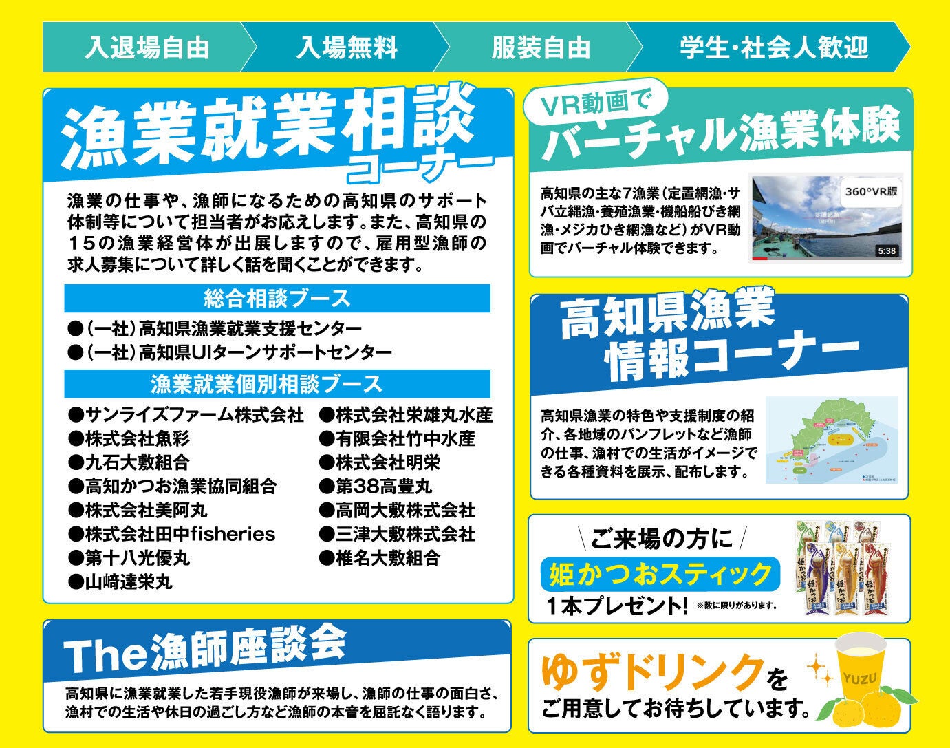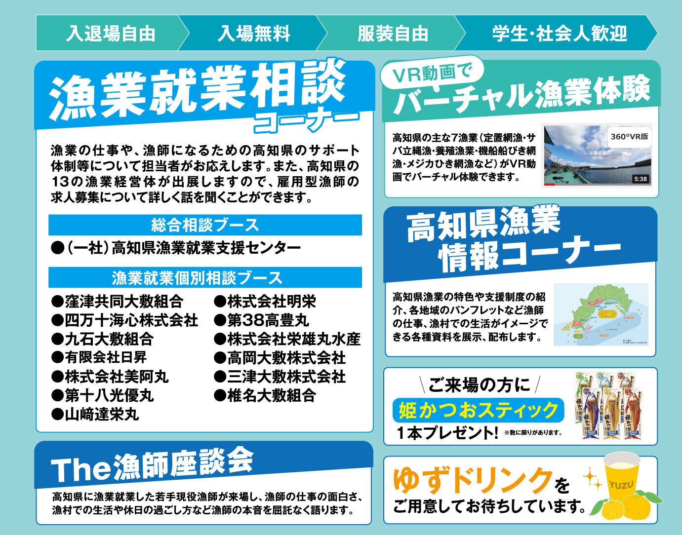 漁業の仕事や、漁師になるための高知県のサポート体制等について担当者がお応えするほか、移住相談のブースもあります。また、高知県の16漁業経営体が出展しますので、雇用型漁師の求人について、詳しく話を聞くことができますよ!