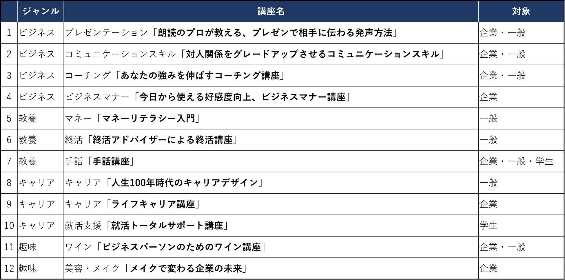 ご提供する講座は、ビジネススキルや教養を身につけるものからワインや美容などの趣味をテーマにしたものまで、幅広いラインナップをご用意しています。