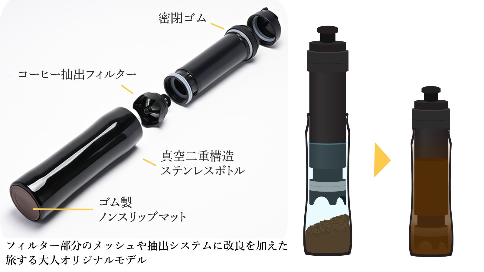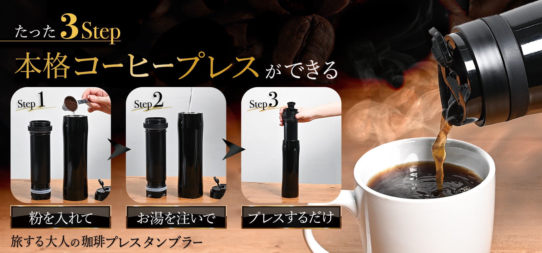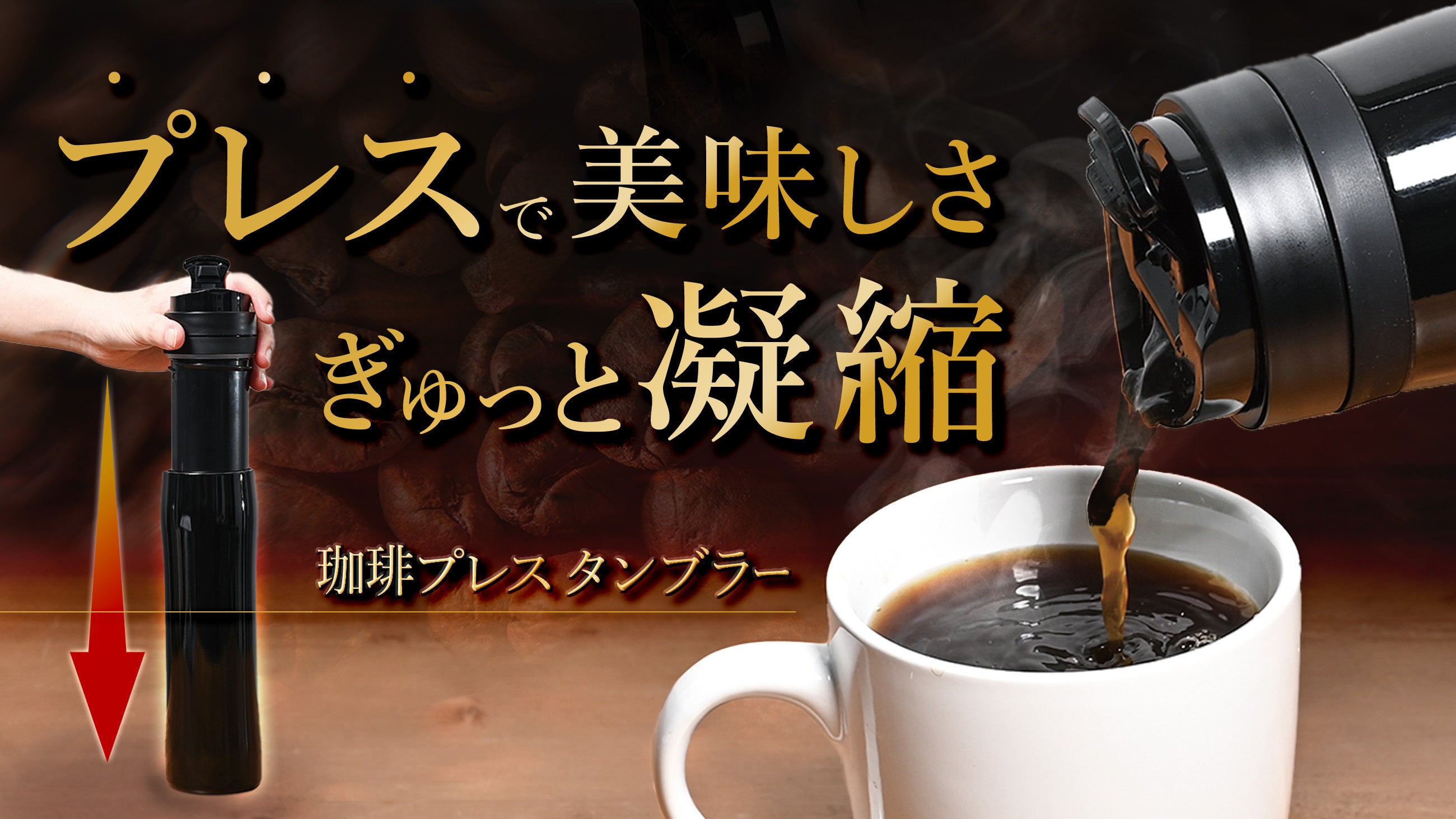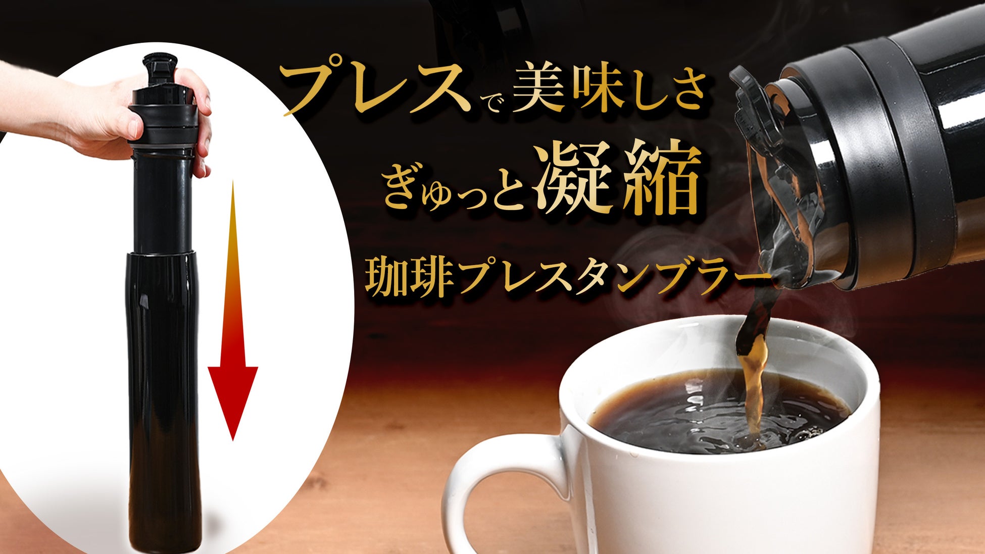 『珈琲プレスタンブラー』は独自のドリップシステムで、味を凝縮させた本格的なコーヒーを淹れることができ、手軽に持ち運びできるように工夫された商品です。