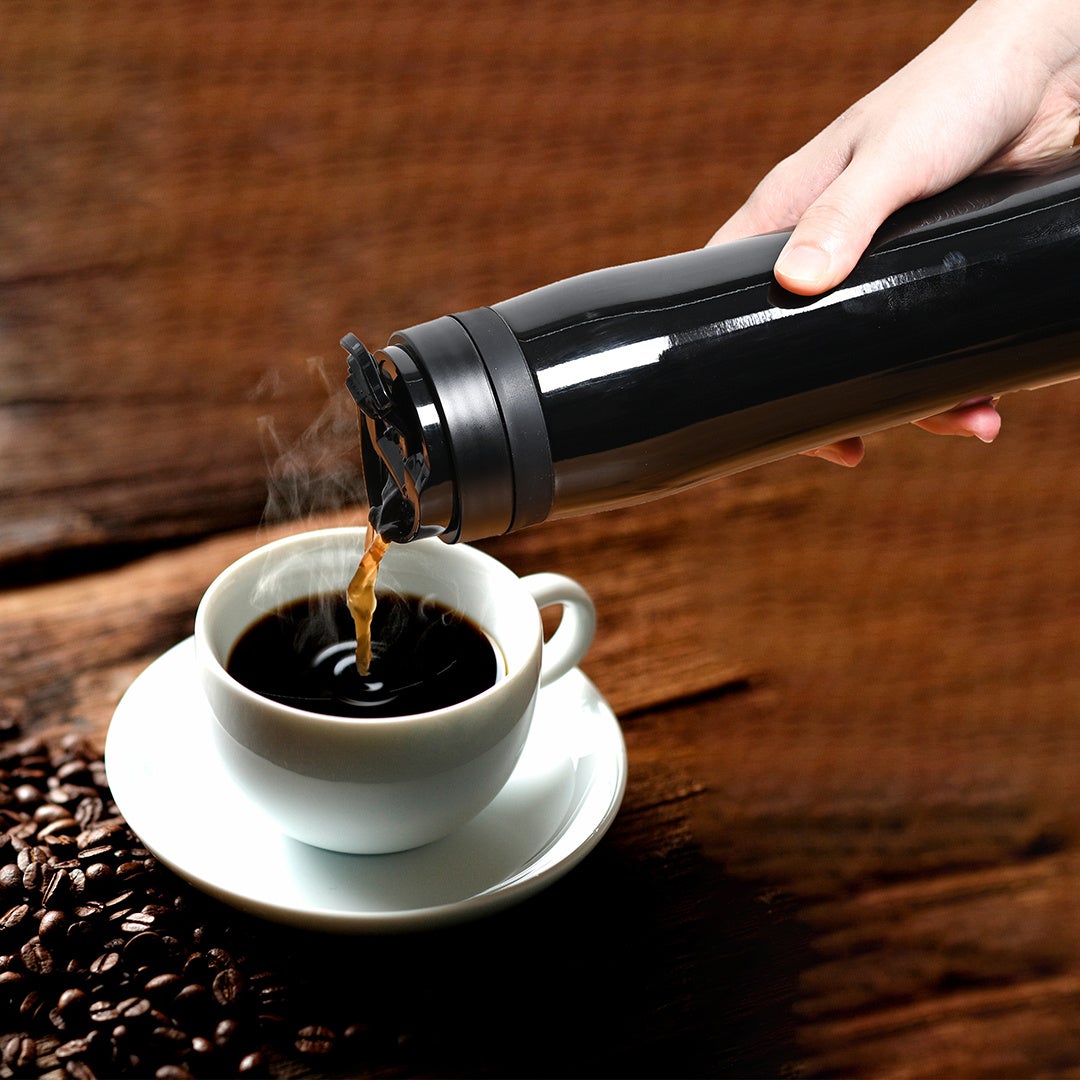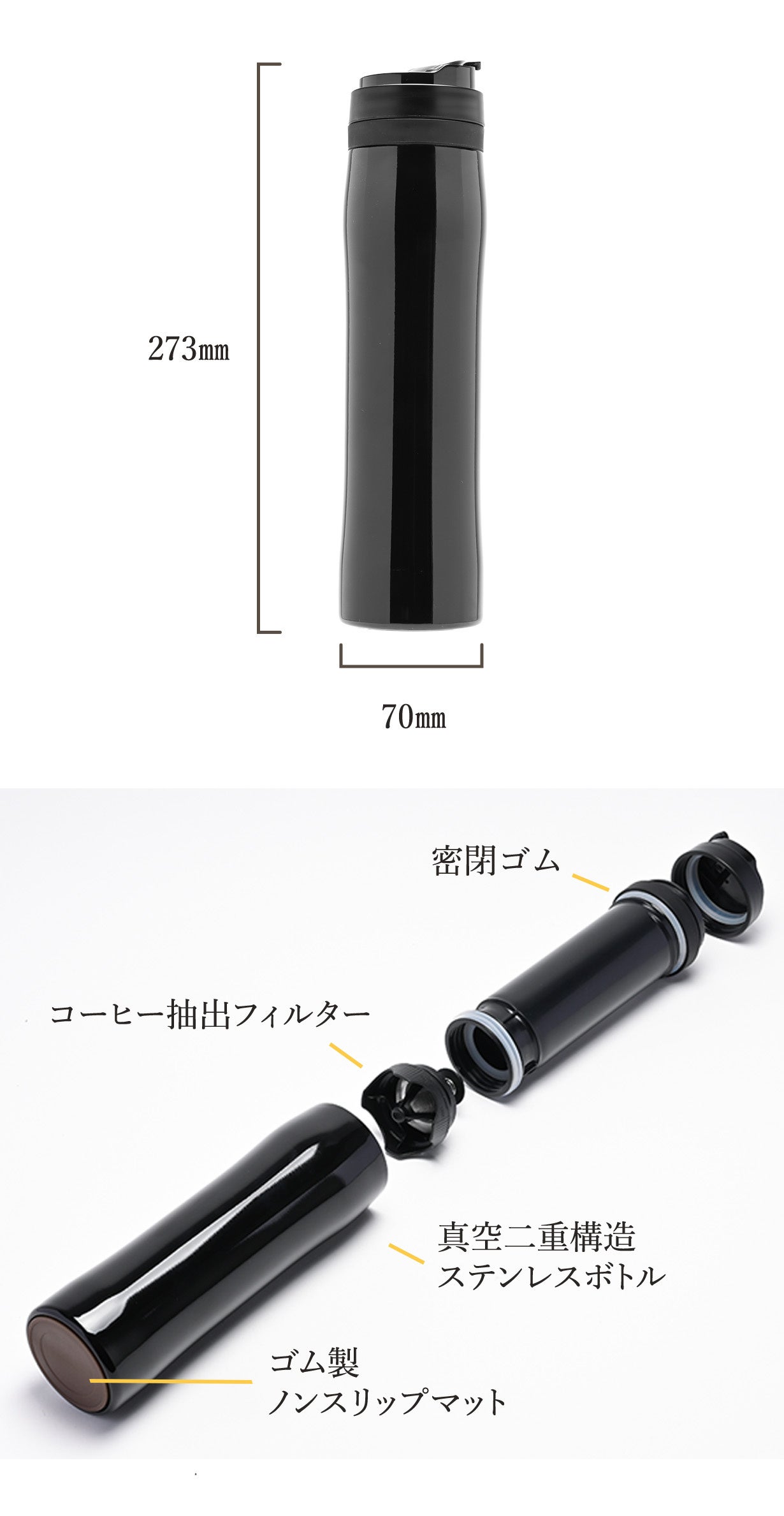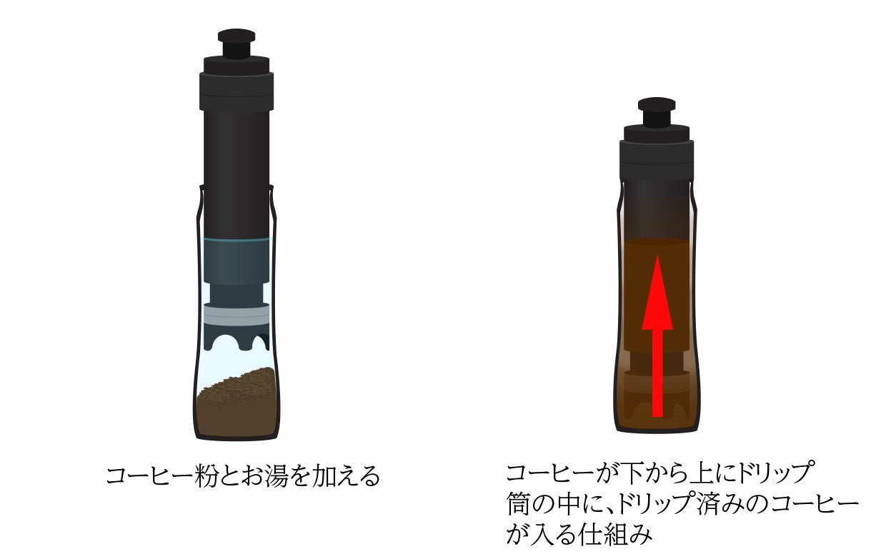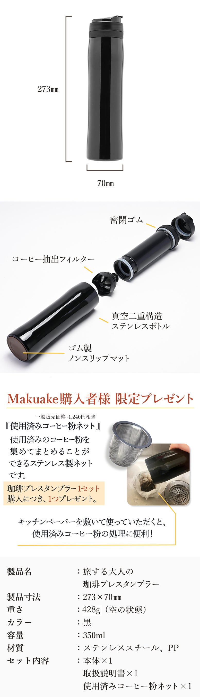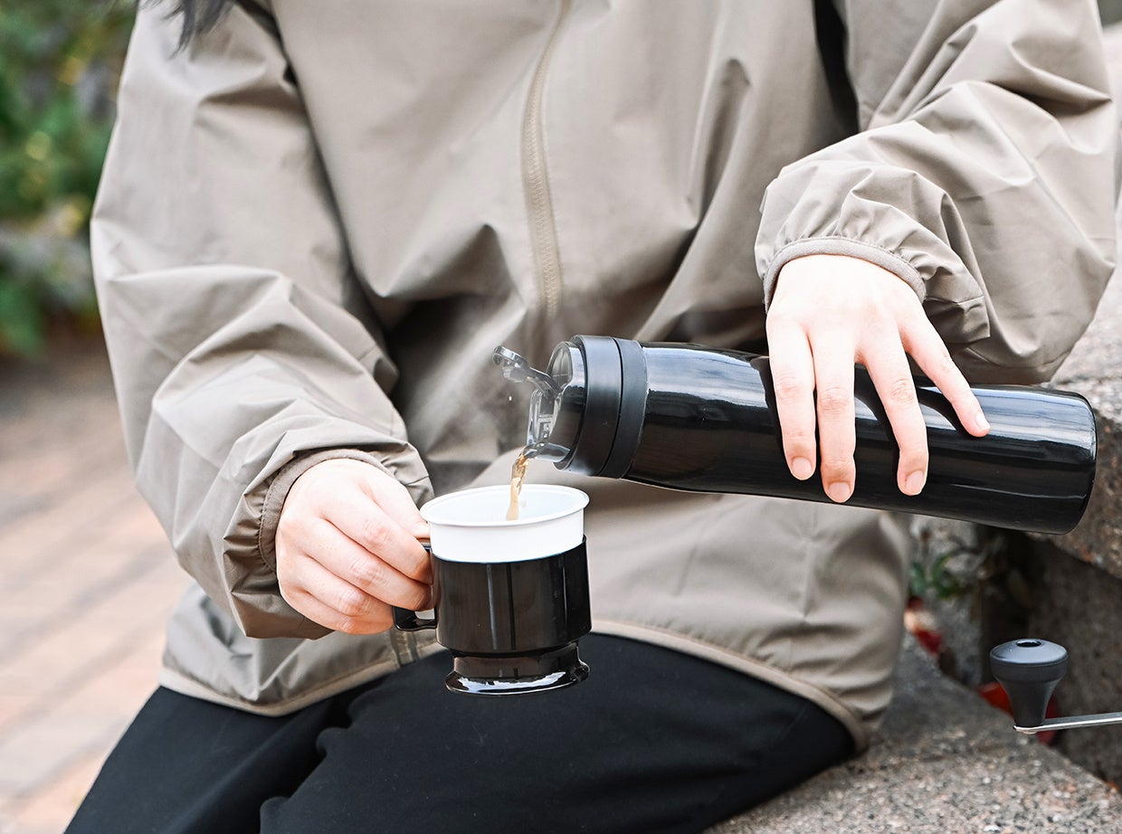 『珈琲プレスタンブラー』は独自のドリップシステムで、味を凝縮させた本格的なコーヒーを淹れることができ、手軽に持ち運びできるように工夫された商品です。