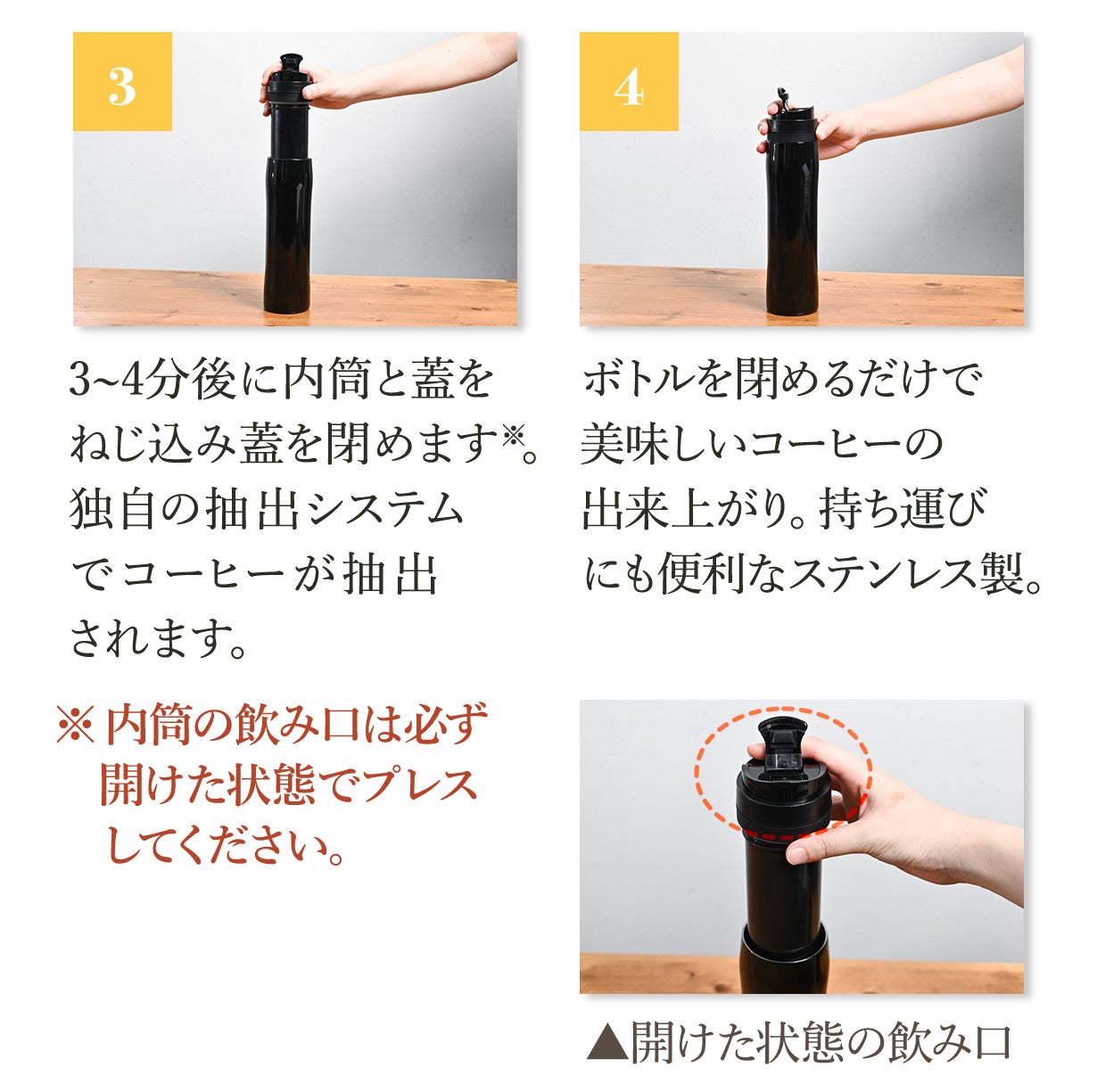 コーヒー粉とお湯を加え、3分後に内筒でプレス することでコーヒーが下から上に抽出される独自構造を採用! プレスすることで、コーヒーオイルに含まれる旨味や香味が凝縮されます。