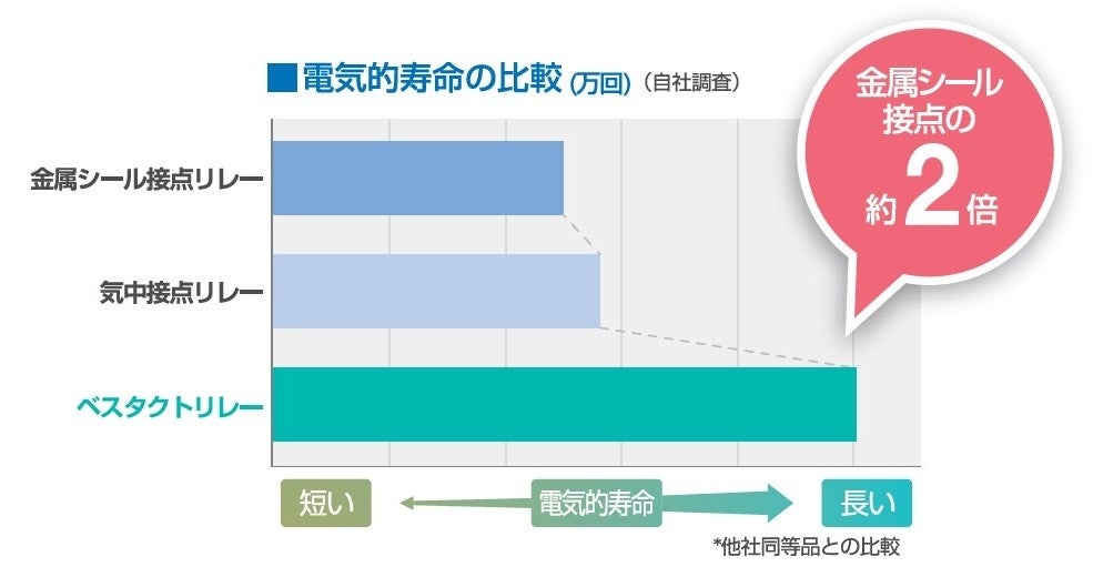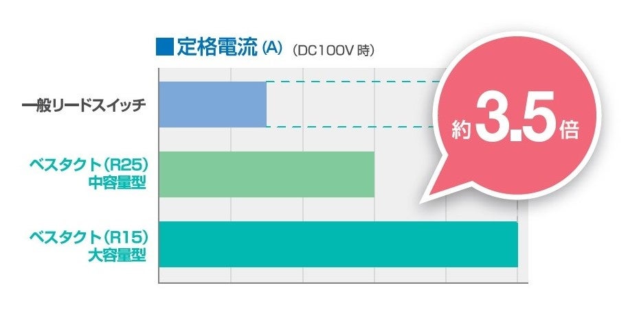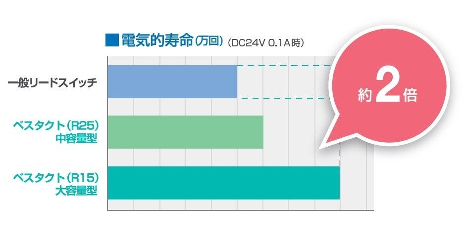 ベスタクトは特殊な接点構造と接点材料によりー般のリードスイッチよりも大きい定格電流を実現しています。特にソレノイドバルブや電磁弁などの誘導負荷の遮断において性能を発揮します。これにより直接制御できる機器の幅が広がるため、回路内の余分な保護回路や小型の接触器を削減し、回路設計者の設計の自由度を高めることに繋がります。またベスタクトの特殊な接点は、接点部の消耗を防ぐ効果も生むため、電気的寿命が長くなります。長寿命なリレーを実現し、リレーの交換頻度を減らすことができます。