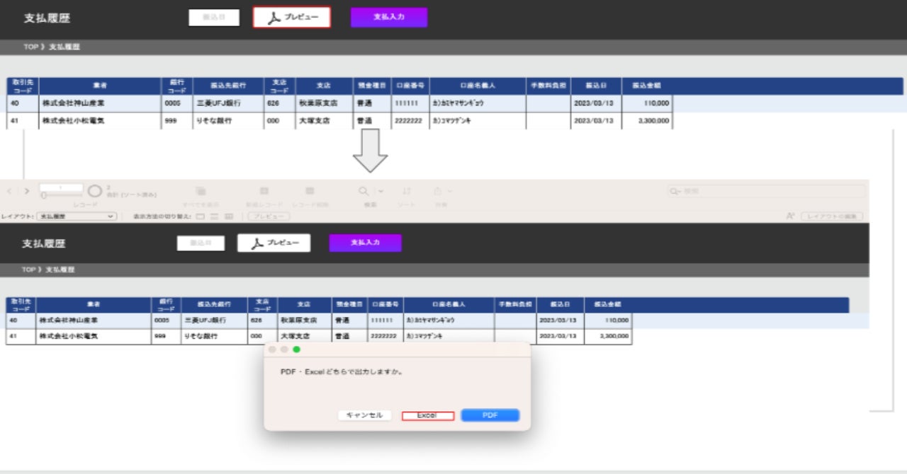建設BALENAは、仕入れ時や発注時に作成した発注データ・買掛データを一覧表示する機能があります。その一覧表示されたデータが全銀協規定フォーマットに自動的に変換できる機能が搭載されました。ネットバンキングから一括で振り込み登録が可能です。