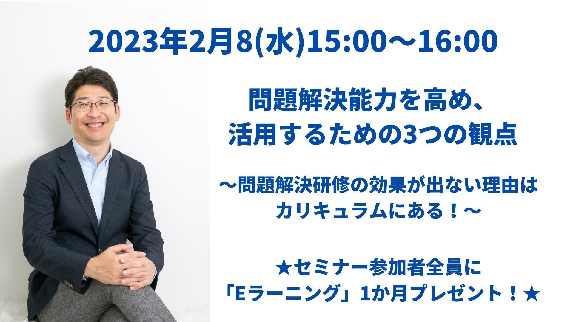 株式会社スキルベース(本社:東京都文京区、代表:高松康平・和田史子)(https://skill-base.co.jp/)は、2023年2月8日(水)にオンラインにて「問題解決能力を高め活用するための3つの観点〜問題解決研修の効果が出ない理由はカリキュラムにある!〜」を開催いたします。弊社の高松康平が、問題解決が自然にできる状態(スキルベース)になるためのコツを、「4つの視点と武器」「個人力を高める方法」「組織力を高める方法」の3つの観点から解説します。