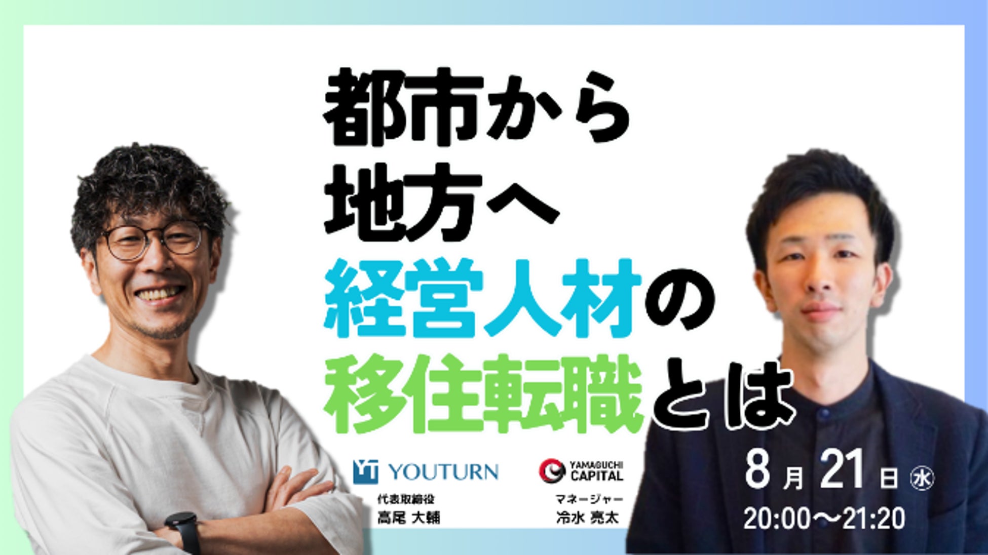 【都会で働くビジネスパーソンへ】経営人材として地方へ移住転職しませんか?山口キャピタルとYOUTURN高尾氏が、8/21(水)20:00~無料ウェビナーを実施