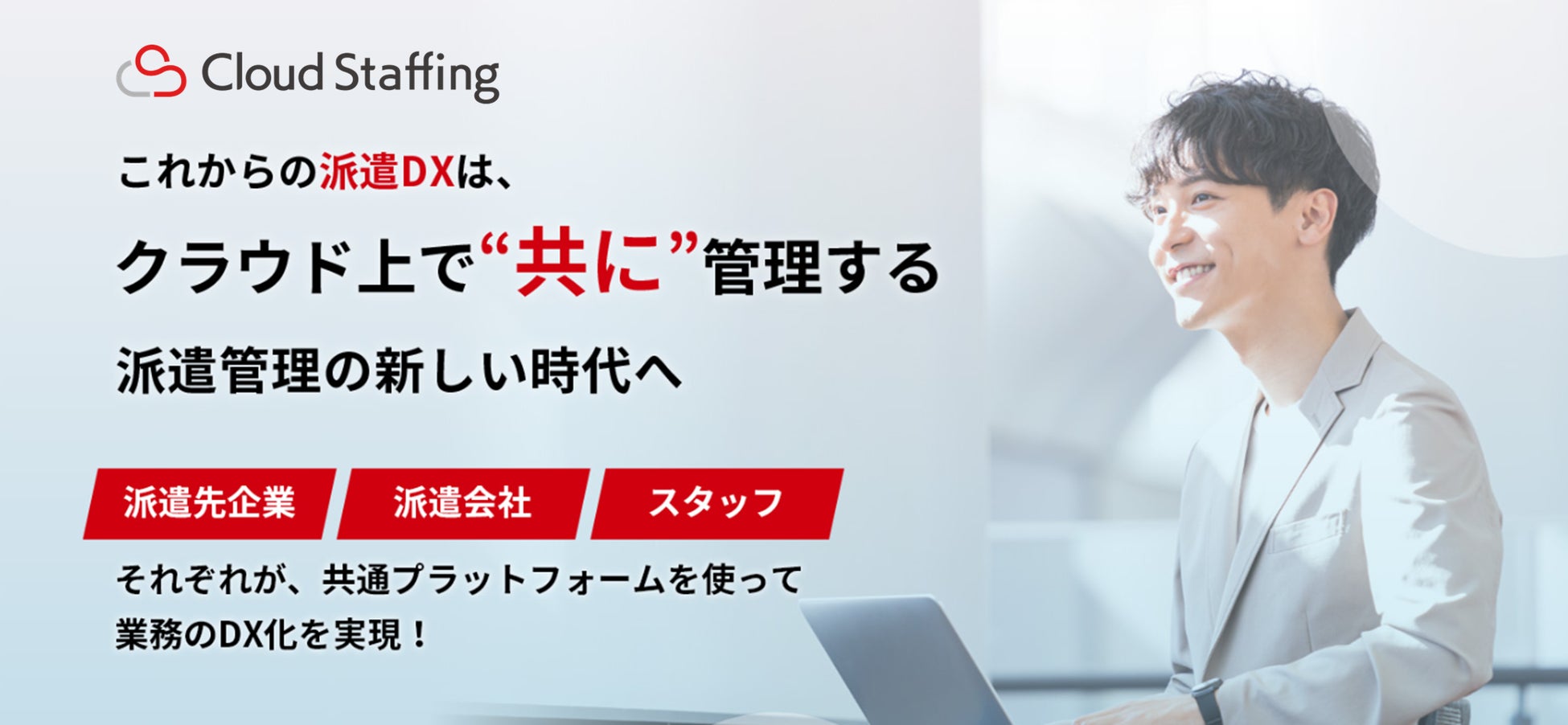 2022年10月より、サービスの提供をスタートした『人材派遣業務一括管理システム クラウドスタッフィング』は、人材派遣をご利用される派遣先企業様と派遣会社様と、その派遣スタッフ様が、クラウドスタッフィング上の共通のプラットフォームを使う事で、これまでの膨大な紙での書類管理からの脱却、法対応への不安の解消、契約書や請求書の押印や郵送をゼロにする事が可能なシステムになります。