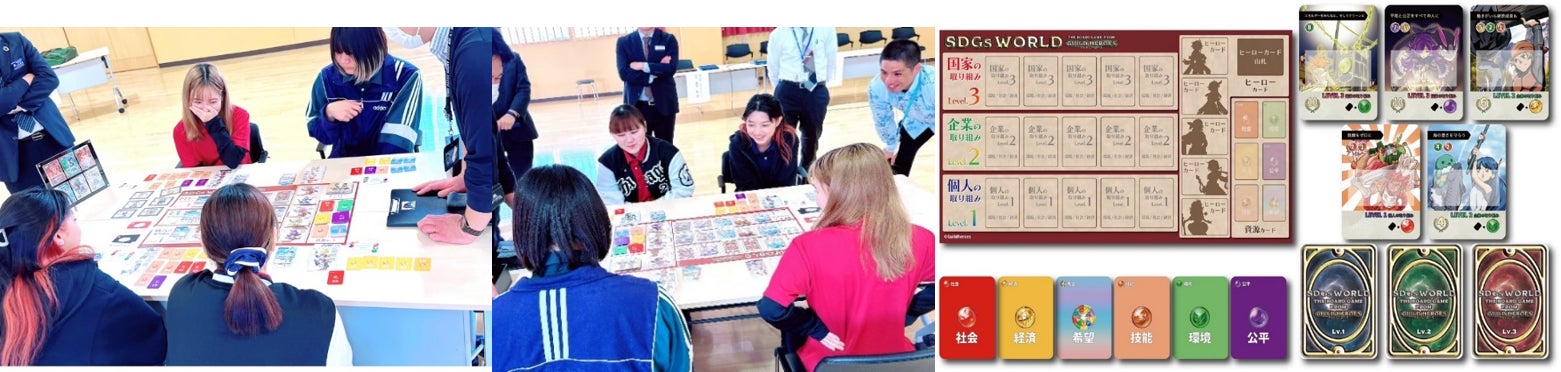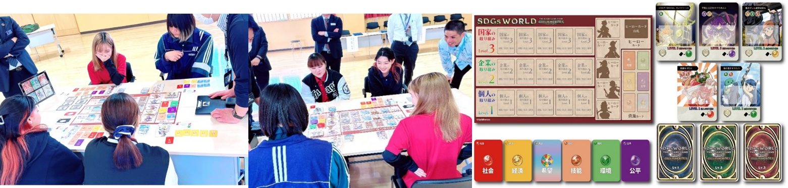 SDGsワールドは、実際にSDGsの推進活動に行動することを目的としたボードゲームで、プレイヤーが直接SDGsの目標達成に向けたリアルな活動に参加し、その過程で学び、SDGsに関する自身の体験やアイデアをゲームに採用できます。SDGsゲーム制作により意識を高めることを促す設計になっています。