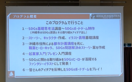 そのような中、沖縄県沖縄市で広域通信制課程と全日制課程の学校を設置する学校法人仙台育英学園からご要請をいただき、ゲーム×マンガスキルの習得でSDGsを学習する教育研究を実施すること、そして沖縄市のPRに貢献する地方創生プログラムの開発および実施を目的とする共同教育研究での連携協定を締結しました。その後、沖縄市や学校内外とのパートナーシップ、SDGsゲームの制作、マンガスキル講座、起業家入門講座、SDGsヒーロー制作などからなる地方創生教育プログラムを共同開発し、ILC沖縄における探究学習(総合的な探究の時間)の授業において、2023年10月~2024年1月の4か月をかけて実施することとなりました。