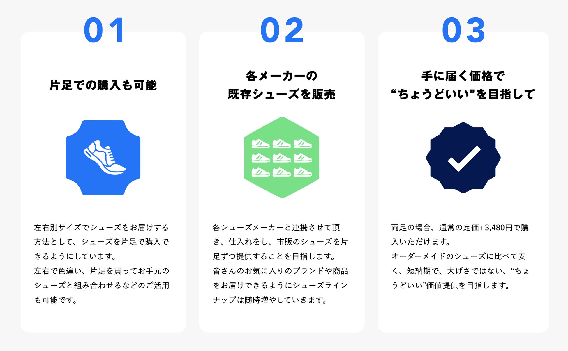 シューズ片足購買サービス『DIFF.』の特徴は3つです。