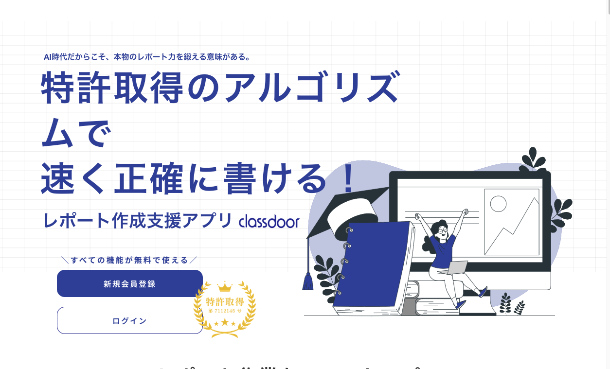 「classdoor」は、特許を取得した独自のロジックによって、5040通りあるレポートの型から、最も適切なレポート構成をレコメンドします。レポート課題に関する簡単な質問に答えるだけで、だれもが適切な文章構成のレポートを書くことができ、より質の高いレポート作成を可能にします。また、文章構成に悩んでいた時間を短縮することで、レポート作成の時間を大幅に短縮します。