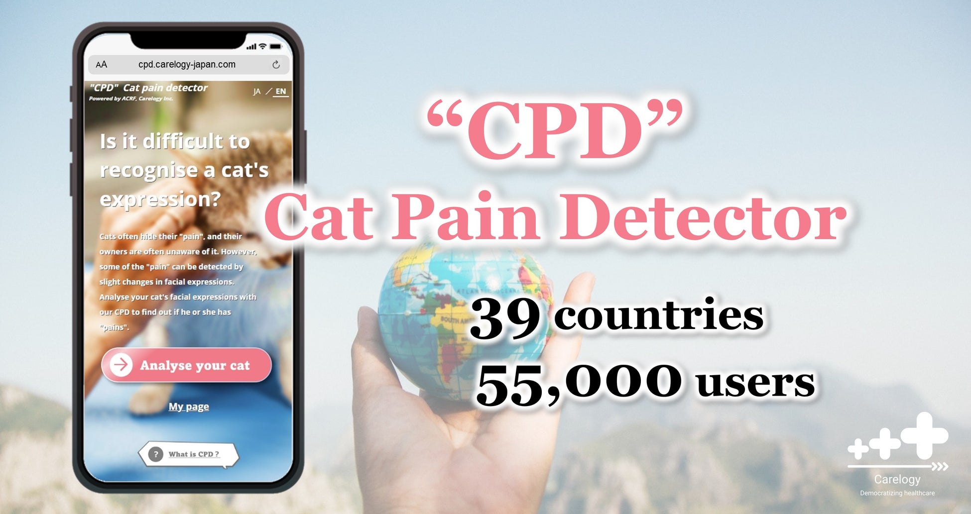 AIを活用したペットテック事業を展開する、株式会社Carelogy(本社:東京都中央区、代表取締役:崎岡豪)は、2023年5月16日にリリースした猫の痛み検知AI「CPD(Cat Oain Detector)」ユーザーが、世界39か国・55,000人を突破いたしました。