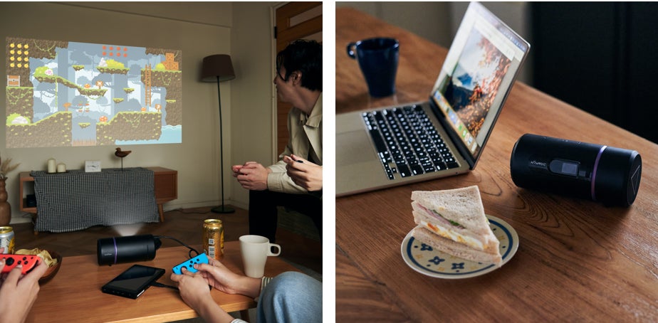 また、USB-C接続のモバイルバッテリーに接続すれば、再生時間を更に延ばすことができます。さらに、内蔵のHarman Kardonスピーカーと合わせて、最大100インチの映像を投影することで、快適に視聴を楽しむことができます。