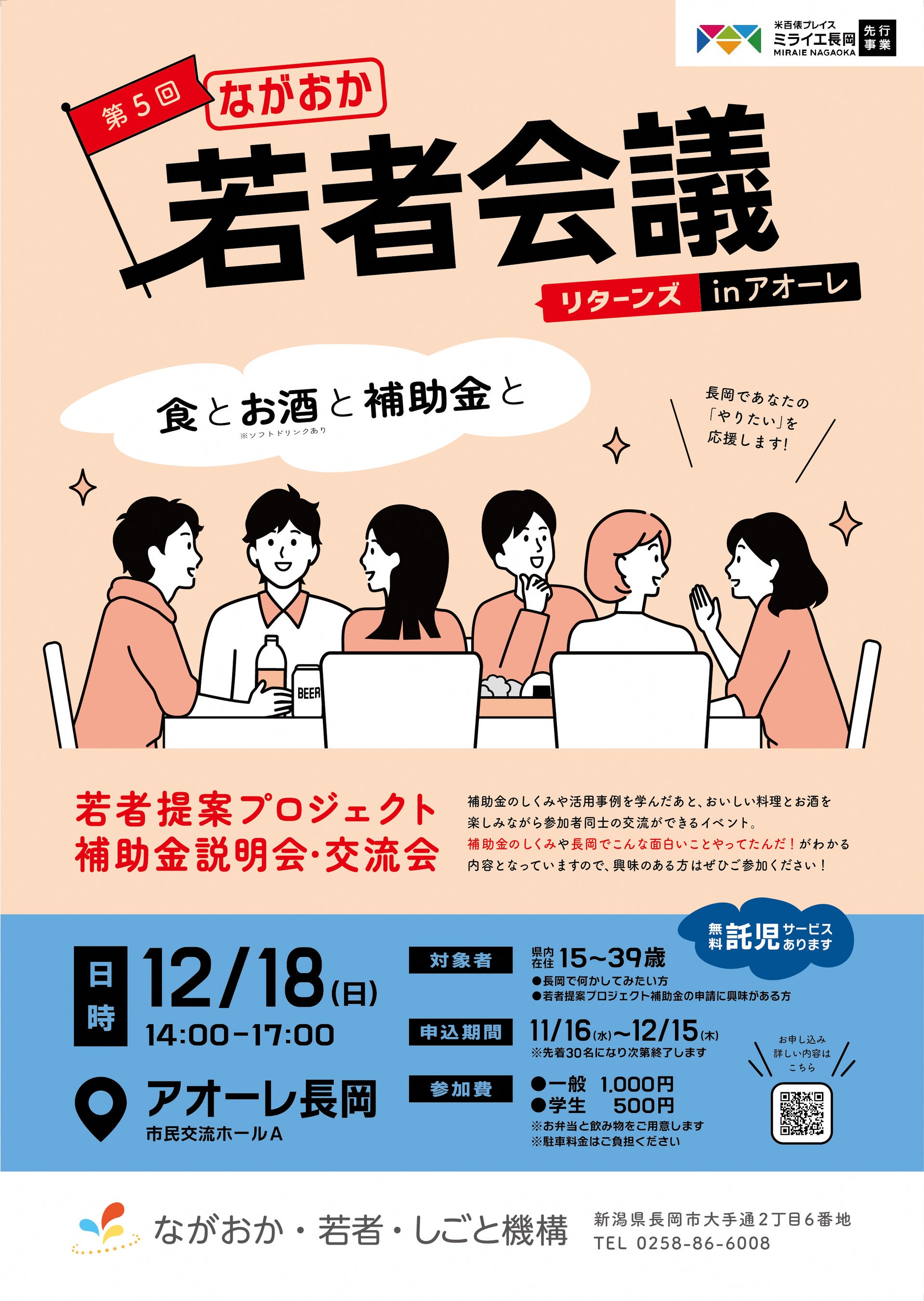 ながおか・若者・しごと機構が提供する「若者提案プロジェクト補助金」の説明会と交流会を合体させたイベントです。補助金のしくみや活用事例を学んだ後、おいしい料理とお酒を楽しみながら参加者同士で交流します。