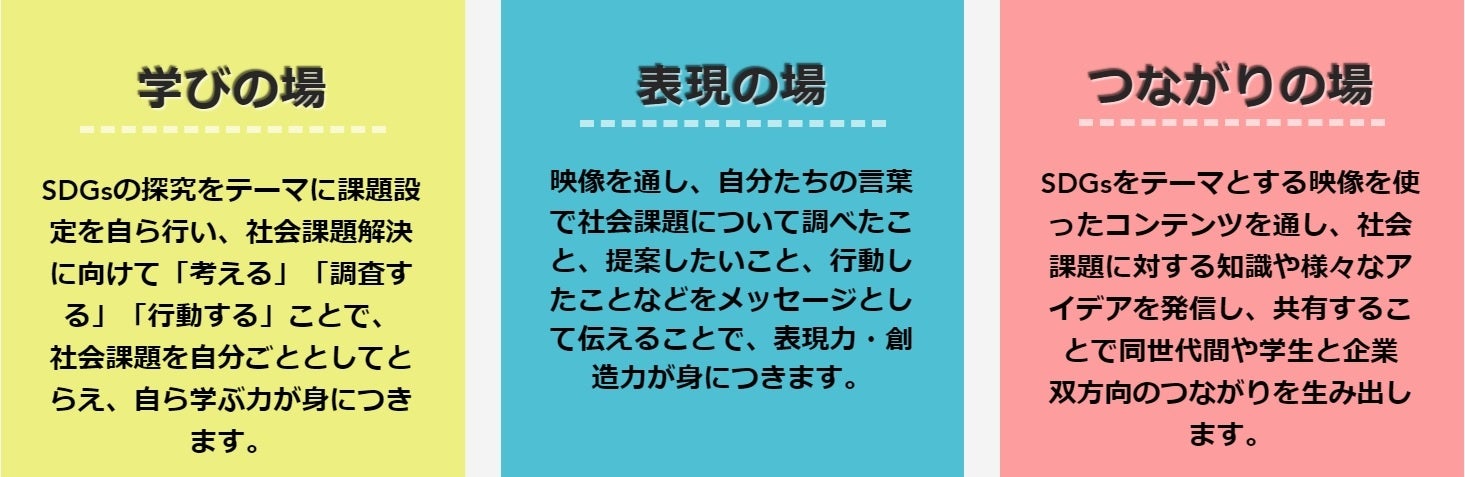 有志大学生により構成される実行委員会が運営主体となり、SDGsをテーマに中高生から動画作品を募集し、審査・表彰を行います。また特設サイトを通してSDGs教材の発信や、オンラインイベントを開催。これからの未来を担う中高生のメッセージを世の中に広く伝え、中高生、大学生、企業が双方向につながり、「社会を変える広がり」を創出することを目的としています。