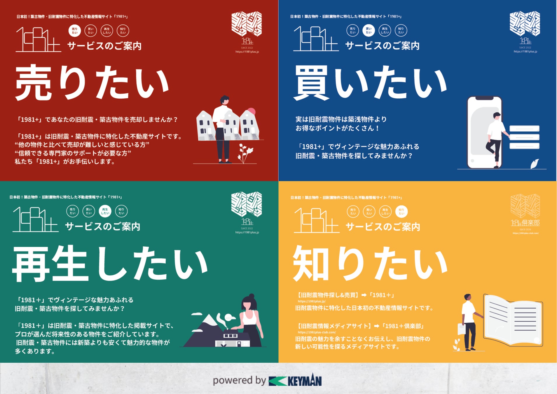 株式会社キーマン(本社:大阪府東大阪市、代表取締役:片山寿夫、以下「キーマン」)は、築古物件・旧耐震物件に特化した不動産情報サイト「1981+(イチキューハチイチプラス)」を2024年11月18日にリニューアルオープンいたしました。それに先駆け、旧耐震物件の新しい可能性を探るメディアサイト「1981+倶楽部」は2024年11月2日にオープンいたしました。この2つの新サイトは、物件の掲載や仲介だけでなく、旧耐震物件に不可欠な「耐震補強」や「活用方法」のご相談まで一括でサポートが可能。旧耐震物件・築古物件に様々な「+プラス」を加えて新しい”カタチ”をうみだすプラットフォームを提供いたします。