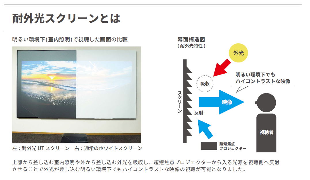 一番の特徴はレンティキュラー構造幕面により、余分な外光や照明光を幕面が吸収しプロジェクターの光源だけを視聴側へ反射させることで、明るい環境下においてもハイコントラストでクリアな映像をお楽しみいただけます。