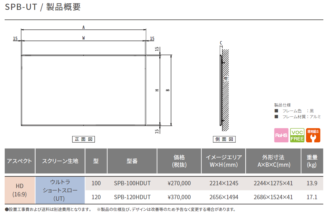 SPB-UTは超短焦点プロジェクター専用スクリーンで、100インチ120インチ(アスペクト16:9)に対応します。