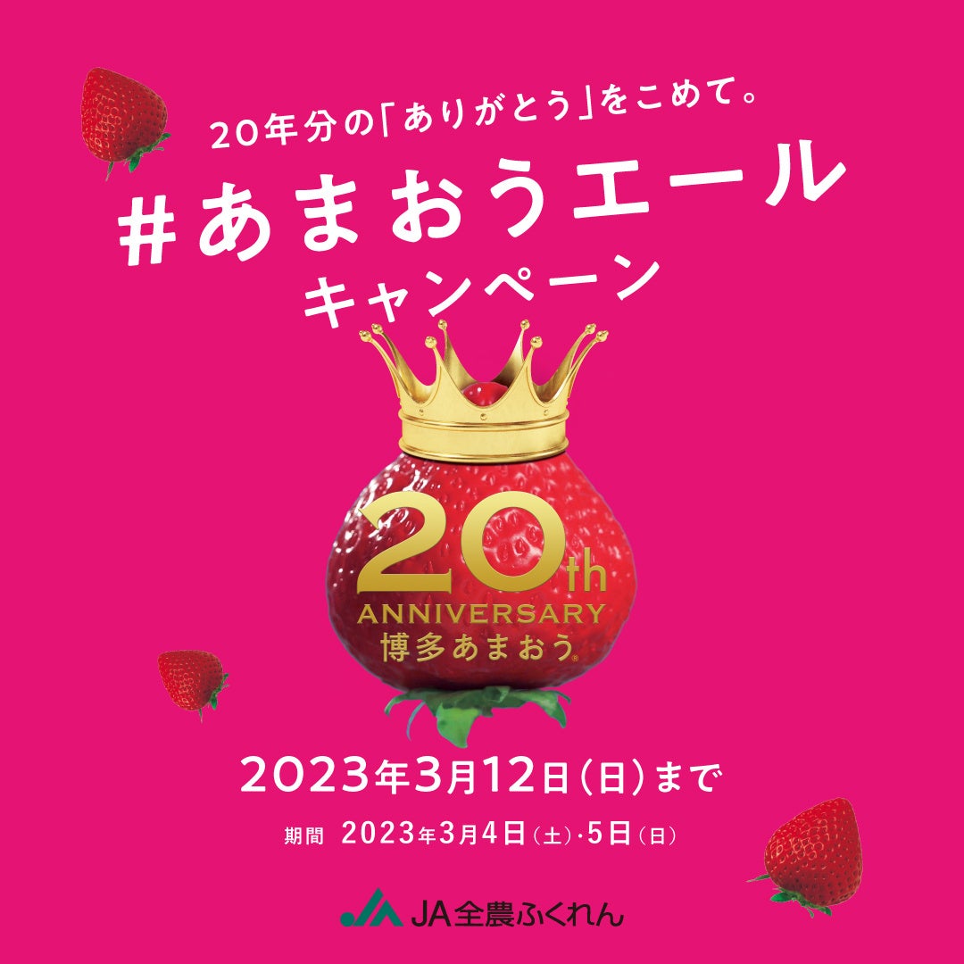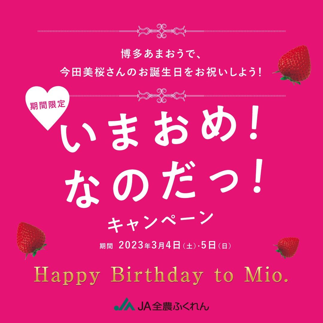 全国農業協同組合連合会福岡県本部(所在地:福岡県福岡市中央区天神4丁目5−23 JA全農ふくれんビル、代表:県本部長 大坪康志) ・JA全農ふくれんいちご部会は、博多あまおう大使であるタレントの今田美桜さんの誕生日(前日含む)である2023年3月4日(土)、5日(日)の2日間にわたって、「いまおめ!なのだっ!キャンペーン」を実施します。