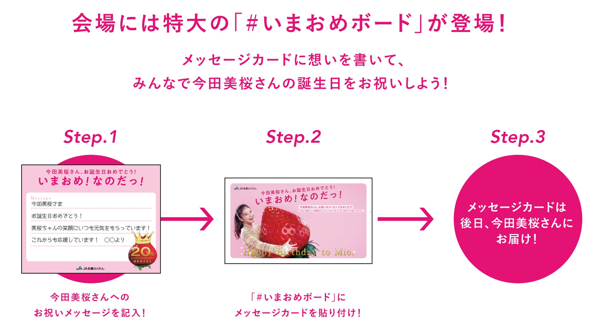 今田美桜さんの誕生日(前日含む)2023年3月4日(土)、5日(日)に東京ソラマチ(ソラマチ広場)を会場に、博多あまおうフェア2023を開催します。博多あまおうの販売の行い、購入者には特別メッセージカードを配布します。今田美桜さんの誕生日&博多あまおう20thに対するお祝いメッセージを記載し、特大メッセージボードに貼ることができる参加型の企画も実施。他にも博多あまおうの収穫体験などが豊富なコンテンツが楽しめます。