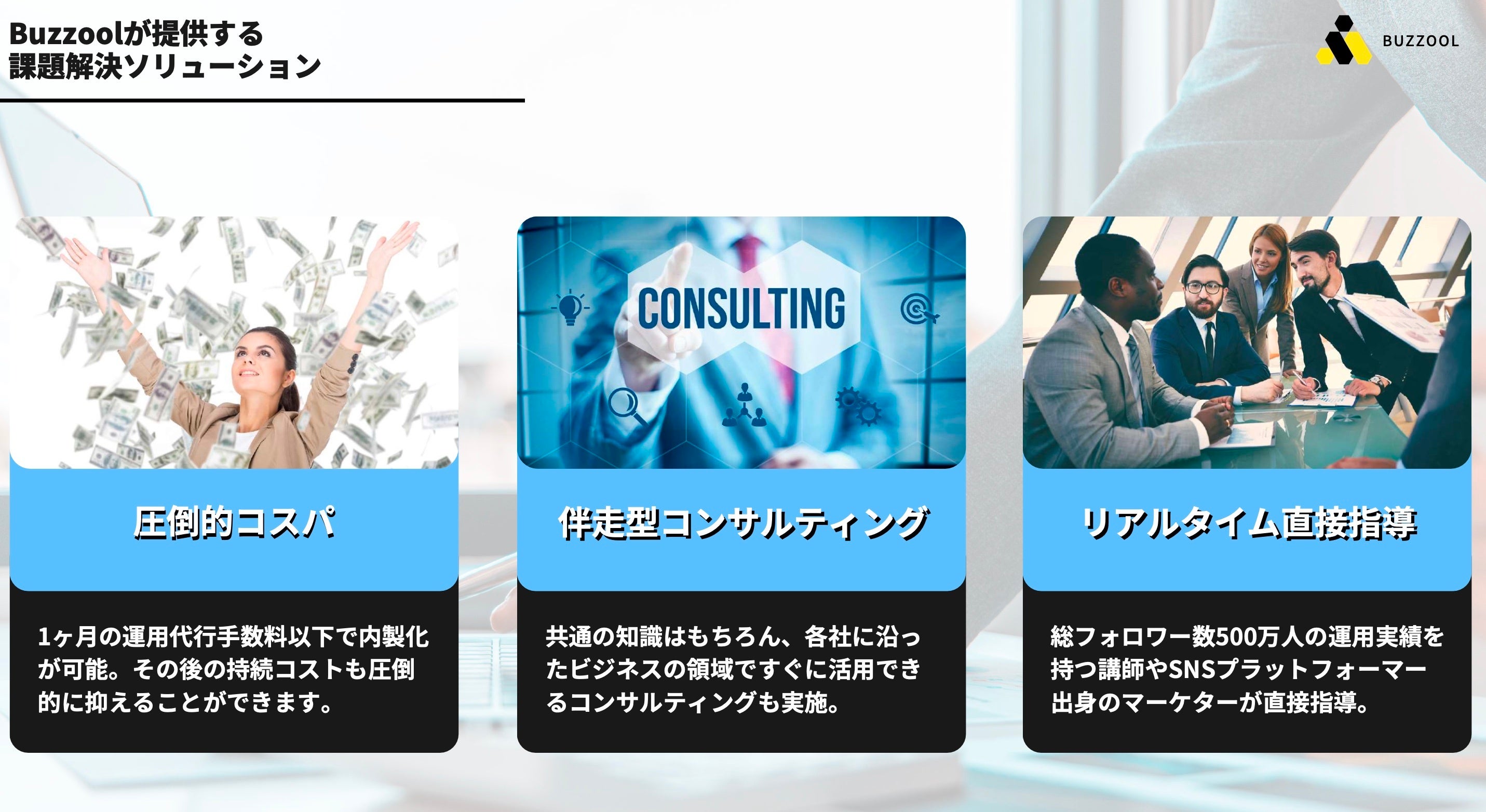 そうした流れから、今後は企業もビジネス領域でのSNS発信が重要となり、自社のSNSアカウントがホームページやLPの代わりになる時代の中で、自社でのアカウント運営に対してBuzzoolは最大限のお手伝いをさせて頂きます。