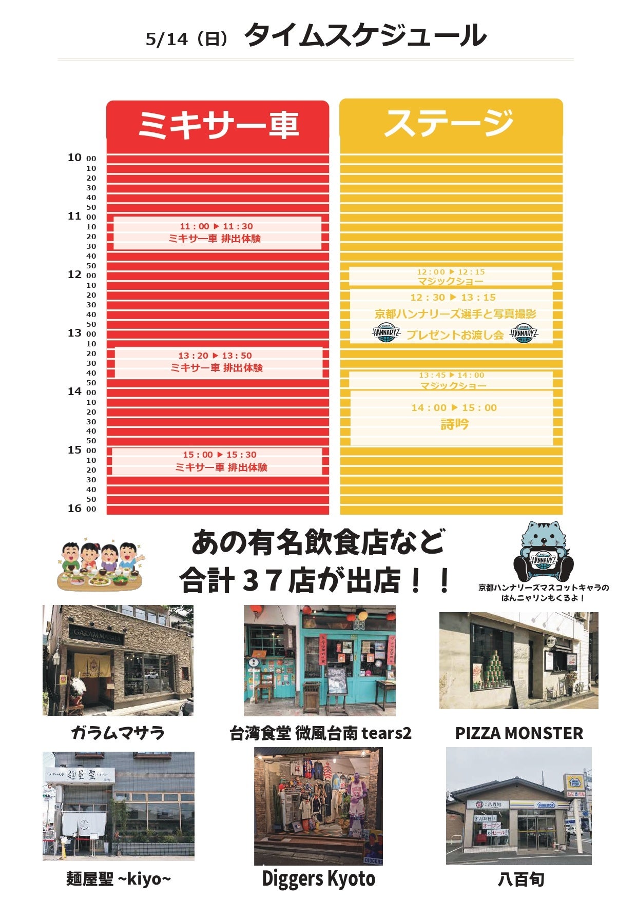 子どもに大人気のミキサー車との記念撮影や乗車体験、さらにはカラーボールをミキサー車から排出する体験も実施。京都ハンナリーズとのコラボイベントもあり!飲食店等の出店も多数出店。