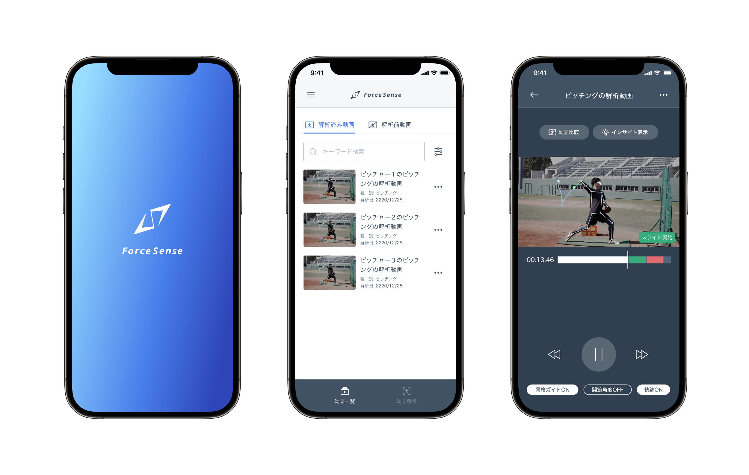 また、残像表示、スローモーション再生、インサイト(解析結果)表示、比較機能により解析結果をわかりやすく表示・確認することができます。今後、様々な機能も搭載予定しております。