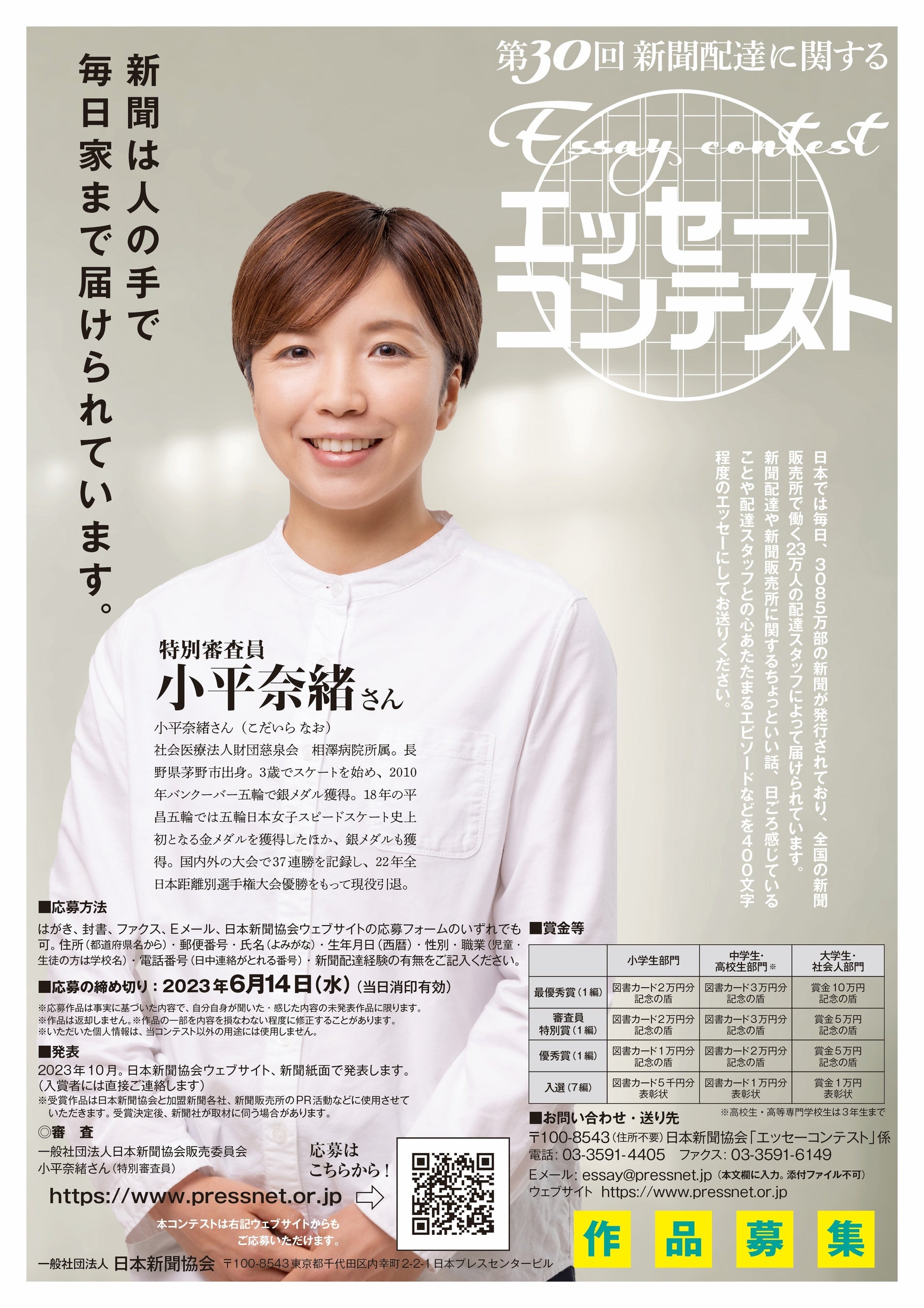 日本新聞協会は、「新聞配達の日・新聞少年の日」〔2023年は10月15日(日)〕に向け、「第30回新聞配達に関するエッセーコンテスト」を実施する。今年の特別審査員はスピードスケート五輪金メダリストの小平奈緒さんが務める。