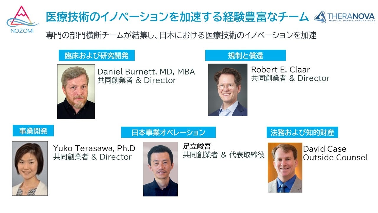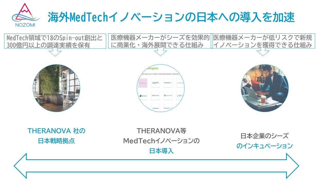 MedTech領域で17の Spin out 創出と3億米ドル以上の民間資金調達実績を保有するTheranova 社の日本戦略拠点としてNozomiを設置し、医療機器メーカー等がシーズを効果的に商業化・海外展開できる仕組みとして、Theranovaの開発製品群を含むMedTechプログラムの日本導入を、クロスボーダーでの多数の契約交渉の実績を保有するNozomiのチームが支援します。