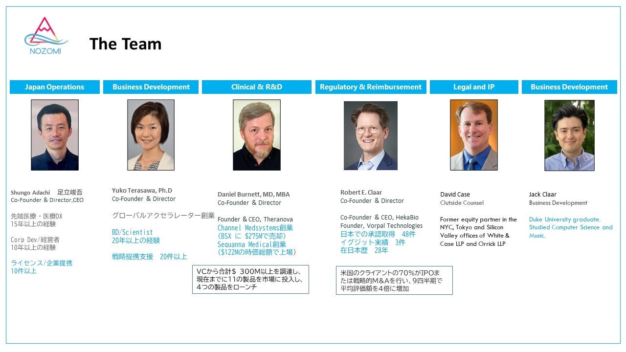 Nozomiは、今後もグローバルな医療機器とデジタルヘルスのイノベーションを日本市場に導入することに特化し、患者さんの治療予後と医療経済の改善を推進することに尽力してまいります。