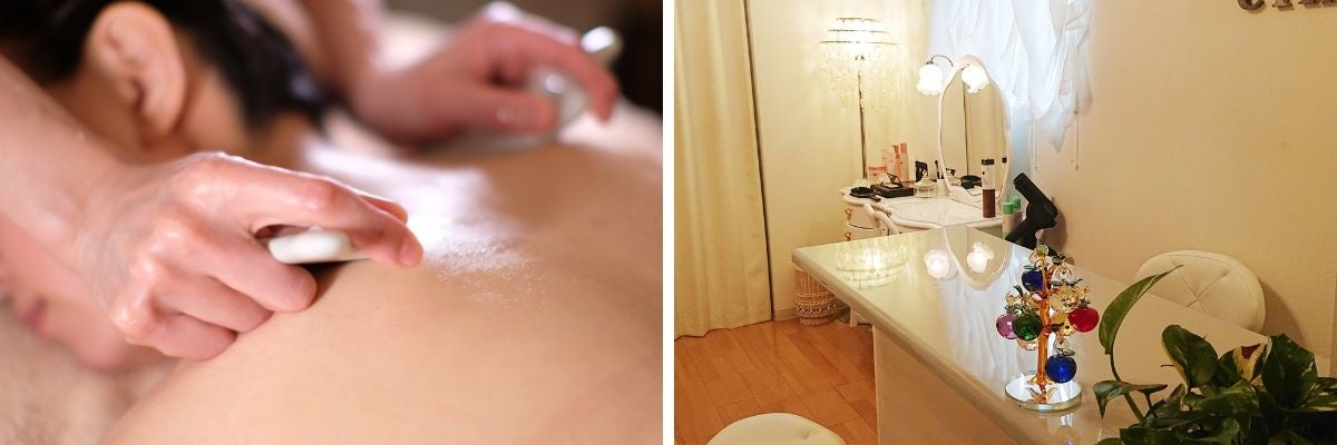 アロマの香り、ヒーリングミュージックが流れる空間でゆったりと自分の時間を過ごしていただけます。お疲れの方はかっさで凝りほぐしを、しわやたるみが気になる方は超イオンケアで若返り効果を実感してください。