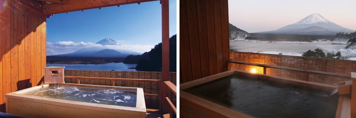 富士山と湖が一望できる絶景のお宿。朝日を背に輝きだす富士山、夕日に浮かぶ赤富士、精進湖とのコントラスト、日に幾度となく表情を変える富士の優美な姿がすべての部屋から望めます。