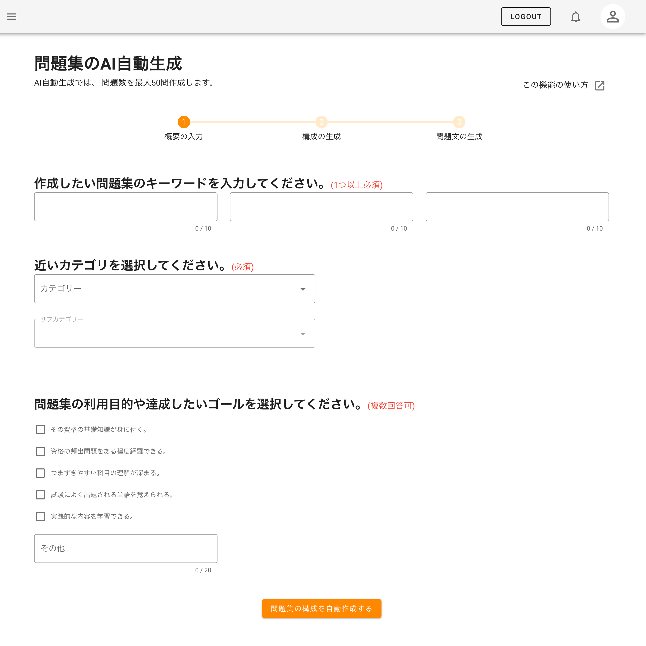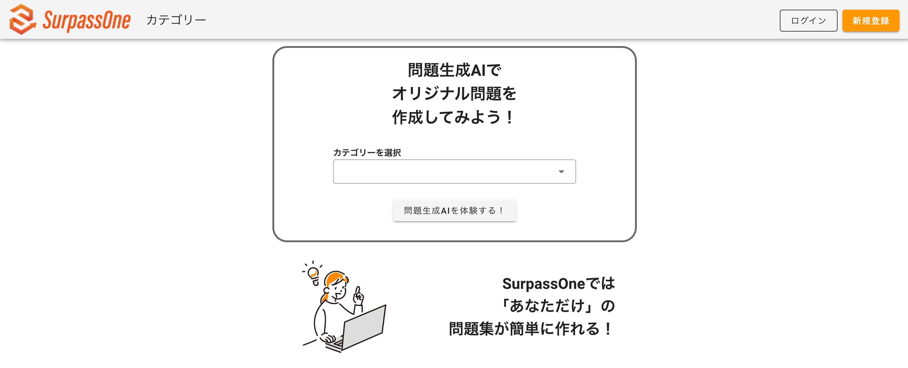 学習サービス「SurpassOne」では実際に問題生成AIをご利用いただけます。新規登録いただくとトップページより問題生成ページに進みます。受講生ページ、講師ページの2種類ありますが、受講生ページでは最大50問、講師ページでは最大300問の問題生成が可能。問題生成AIでは問題のカテゴリーや利用目的、ゴールを選択・入力することで問題文の構成が自動で作成されます。その後セクションや問題数が構成された問題集は編集・削除で自由に修正が可能です。最後に問題集が公開され、実際に試してみることができます。