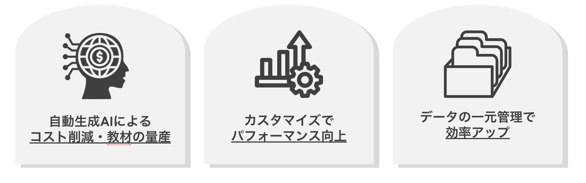 社員教育などの資料作成には人件費・時間などコストがかかりますが、独自のAI技術とChatGPTを掛け合わせた自動生成AIの活用によって解消されます。これにより、短時間での教材の量産、人件費などコスト削減が可能です。