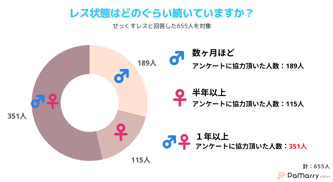 今回、セックスレスと回答した655人を対象にセッくすレスの期間を調査をしたところ、夜の営みが1年以上ない夫婦は、351人と最も多い数値となりました。