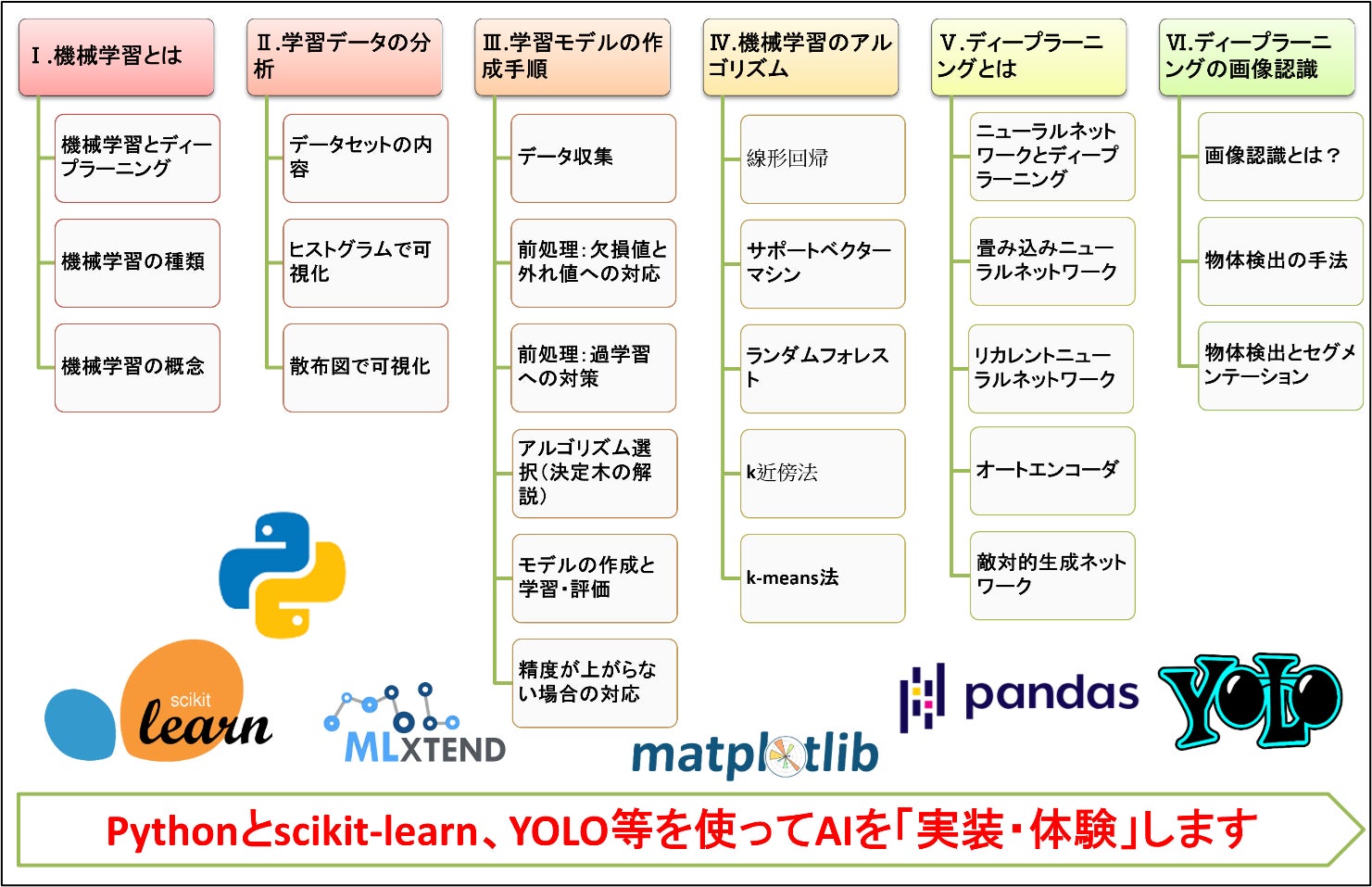 「理解ちゃんと学ぶ【情報Ⅱ・AIコース】」は、文部科学省の高等学校「情報Ⅱ」の教員用研修教材の内容に準拠し、重回帰分析、主成分分析と次元削除、分類、クラスタリング、ニューラルネットワーク、画僧処理等を学ぶことができます。また、Python言語やの機械学習ライブラリを使用して、各種の機械学習アルゴリズムやディープラーニングアルゴリズム、画像認識等を実装・体験できます。