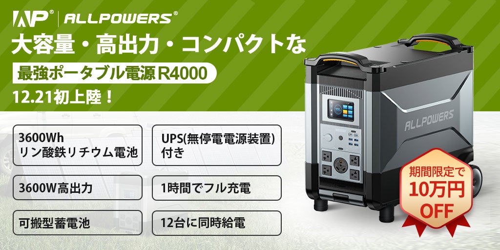 【ポータブル電源新発売】ALLPOWERS超大容量・高出力・コンパクトな最強ポータブル電源R4000日本初上陸!時間限定10万円割引の発売記念キャンペーンを開催!