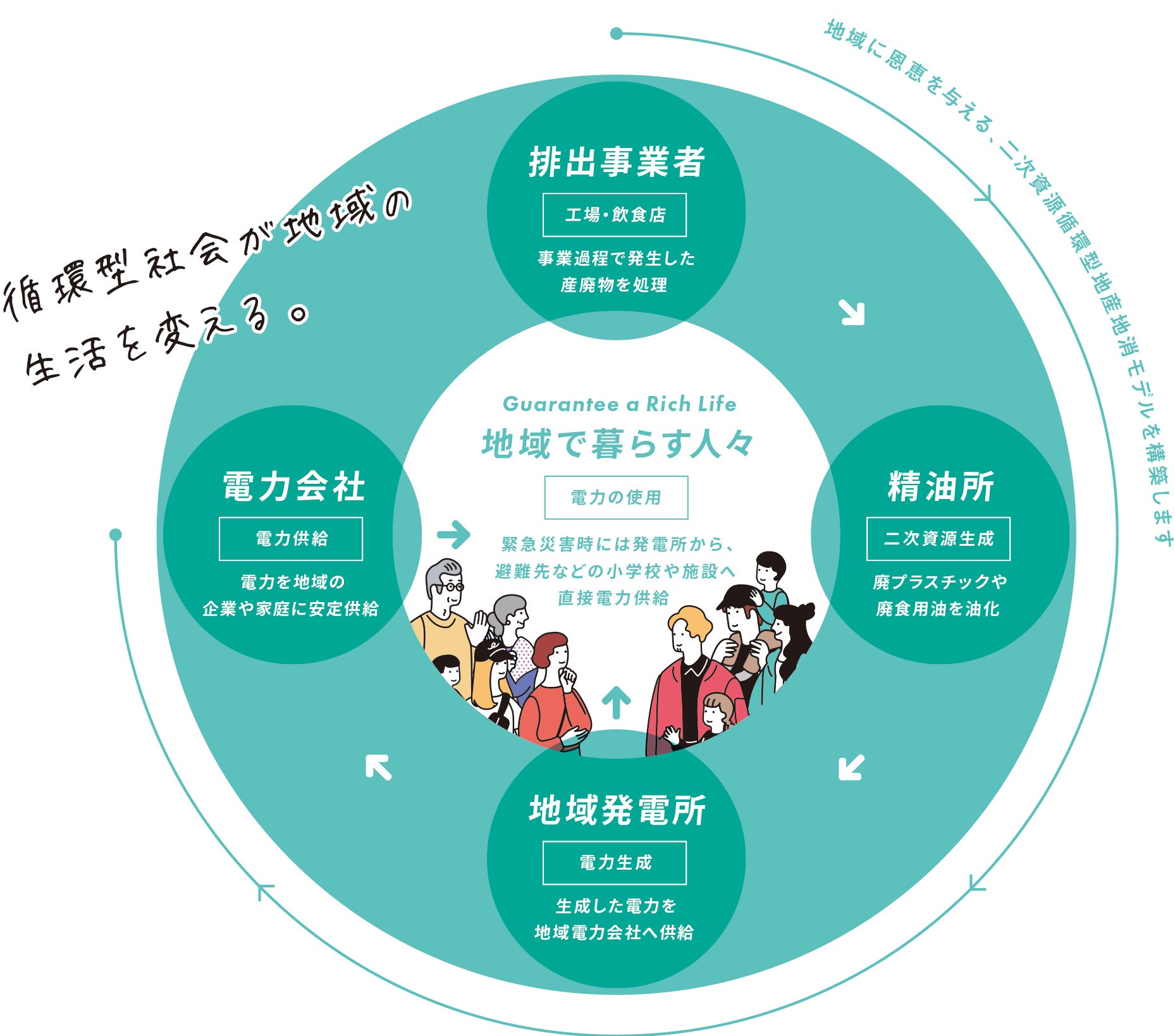 ベナート株式会社は、「兵庫グリーンバイオマスファーム」の運用により、当廃食用油バイオマス発電所が、地産地消循環型で電力の安定供給を実現し、脱炭素化社会に貢献するだけでなく、産業廃棄物の二次利用により、循環型経済社会を実現し、電力問題とゴミ問題の課題を解決いたします。