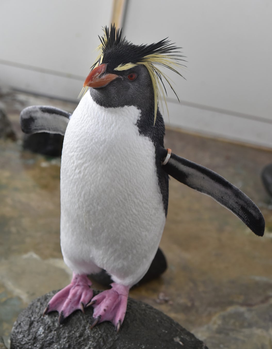 体長約55〜65cmの頭部にある黄色い飾り羽(冠羽)が特徴的なペンギンです。岩場をピョンピョンとジャンプして移動する姿から『イワトビ』という名前がついています。