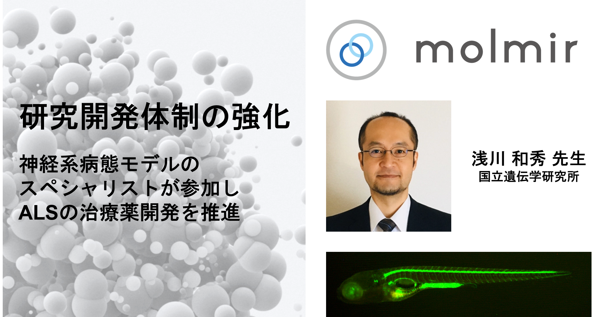 モルミルでは、これまでに、冨田峻介先生(産業技術総合研究所:分析化学の専門家)と齋尾智英先生(徳島大学:核磁気共鳴法の専門家)に科学顧問として参画頂き、分子動態評価技術の開発を進めて参りました。さらに、モルミルでの神経難病に対する治療薬の開発を更に加速させるために、脳神経内科学の専門家である青木正志先生(東北大学)と杉江和馬先生(奈良県立医科大学)を科学顧問に就任頂いております。この度、ALS治療薬開発を強化する目的で、ALSの病態を再現した生物モデルの作製に成功した浅川和秀先生(国立遺伝学研究所・特命准教授)を、モルミルの科学顧問として招聘いたしました。
