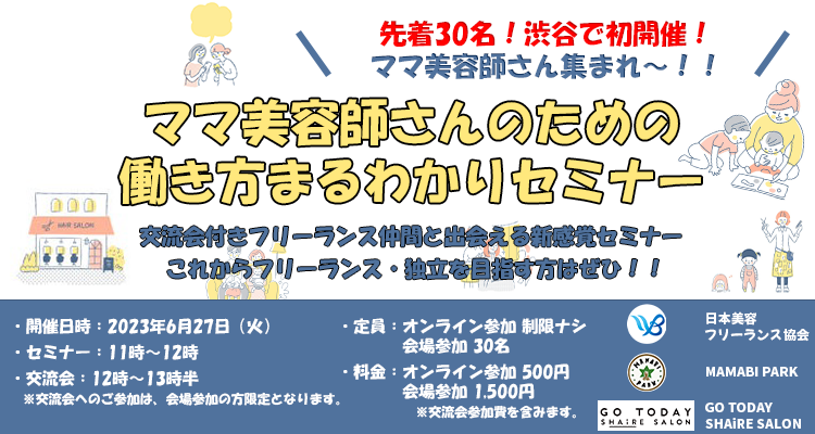 6月27日(火)に開催の「ママ美容師さんのための働き方まるわかりセミナー」では、美容師の新たな働き方として広がりつつある「フリーランス」について、ママ目線で解説します。「フリーランス」という働き方について解説することで、ワークライフバランスを意識した働き方を提案し、ママ美容師が復職しやすい環境を整備します。実際にフリーランス美容師として働くママ美容師の方々やサロン経営者に登壇して頂き、ママ美容師が抱える不安や課題を解決する働き方についてお話しします。